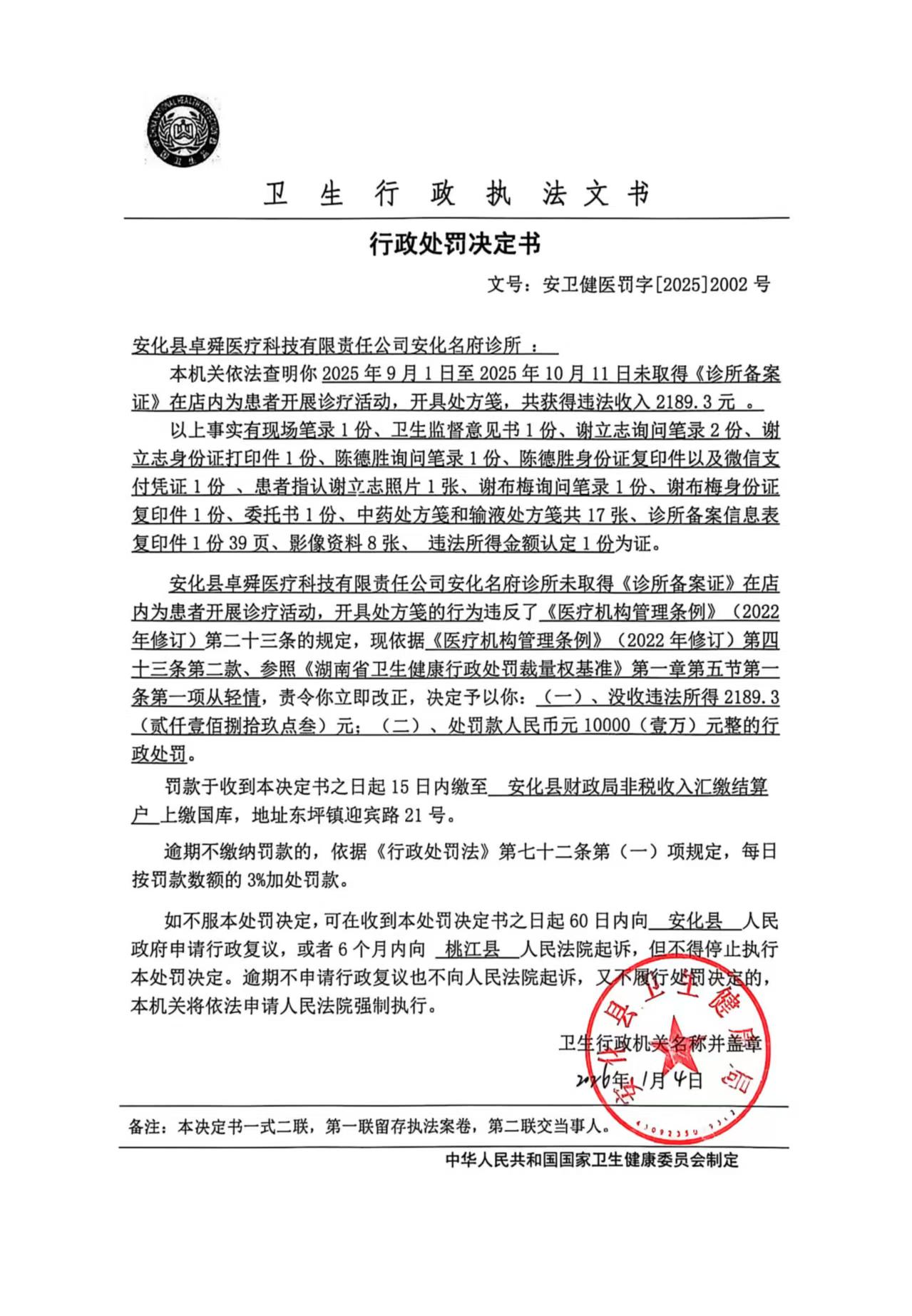 行政处罚决定书(安化县卓舜医疗科技有限责任公司安化名府诊所)