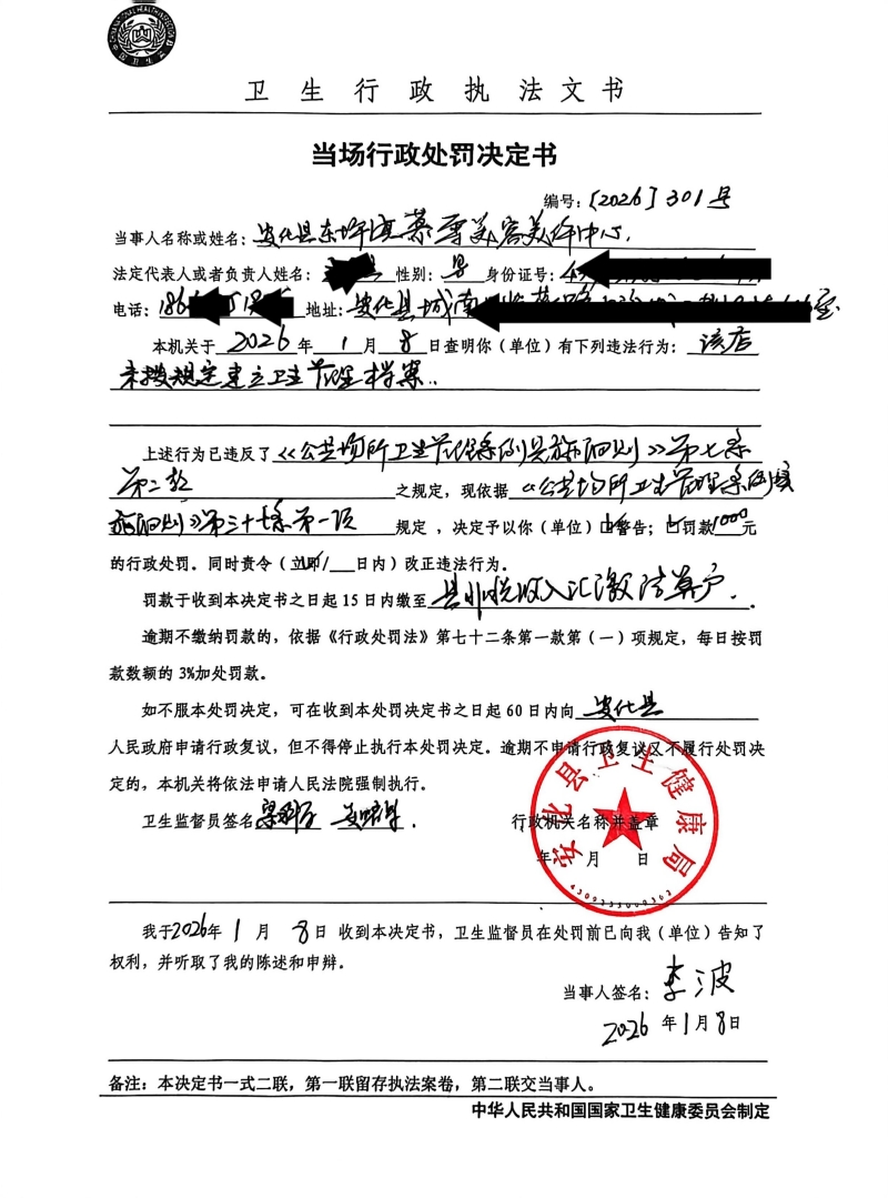 当场行政处罚决定书(安化县东坪镇慕雪美容美体中心)