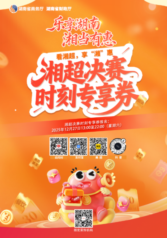 为持续激发市场活力,便利广大消费者就近享消费实惠,湖南省商务厅联合湖南省财政厅近日对“2025‘乐享湖南·湘当有惠’”消费券活动进行专项消费服务升级,特别增设线下“湘超决赛时刻专享券”现场领取通道,将促消费活动与体育赛事深度融合,进一步提升市民参与体验与获得感。