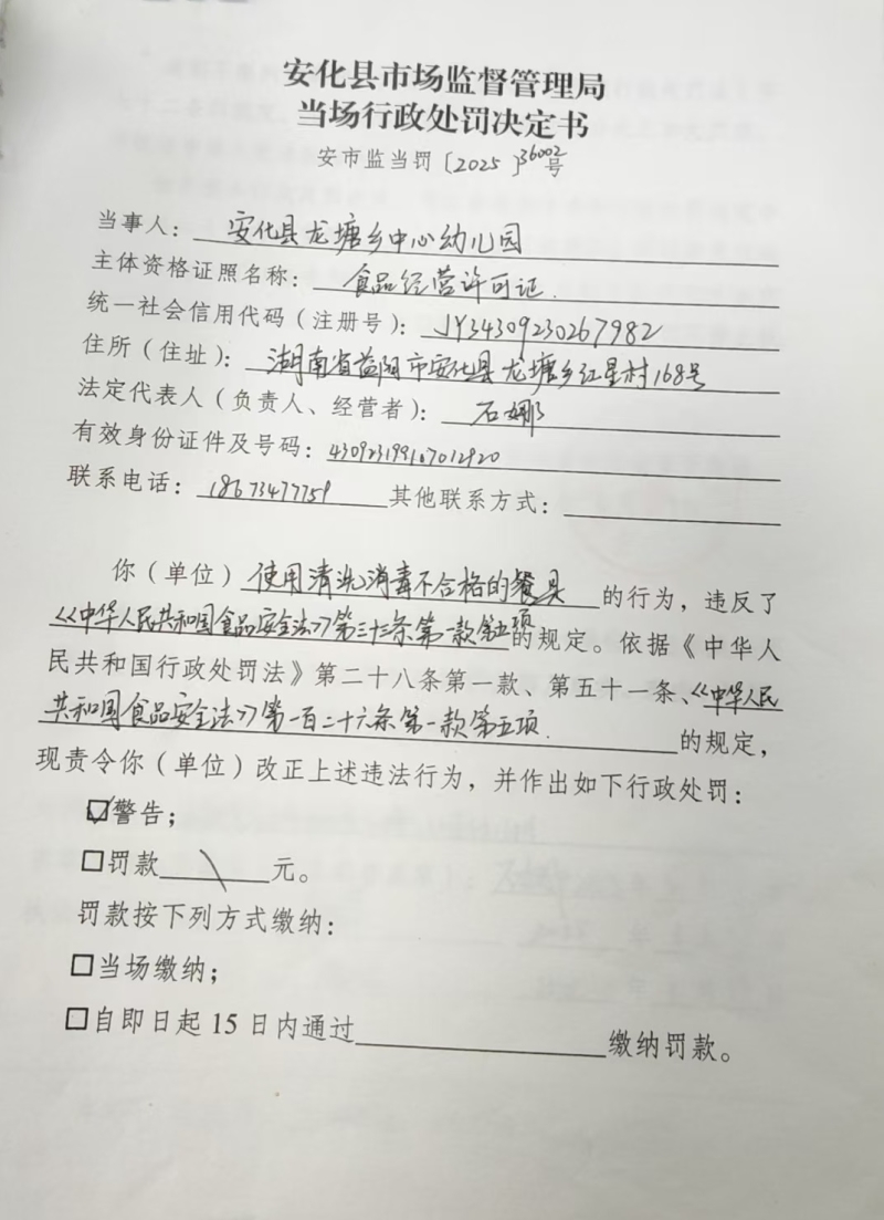 安化县市场监督管理局 当场行政处罚决定书 安市监当罚【2025】36002号