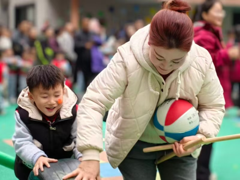 9时50分,团体操表演精彩上演。萌娃们身着统一的园服,手持篮球、花棍灵动起舞,整齐划一的动作、活力满满的姿态赢得在场家长阵阵掌声。10时30分,“动物竞技大闯关”环节欢乐开启,操场内轮胎、平衡木等趣味关卡依次排开,家长们或拉着充气圈载着孩子冲刺,或与孩子携手挑战独木桥,呐喊声、欢呼声此起彼伏,彩色的运动场地化作欢乐的海洋。