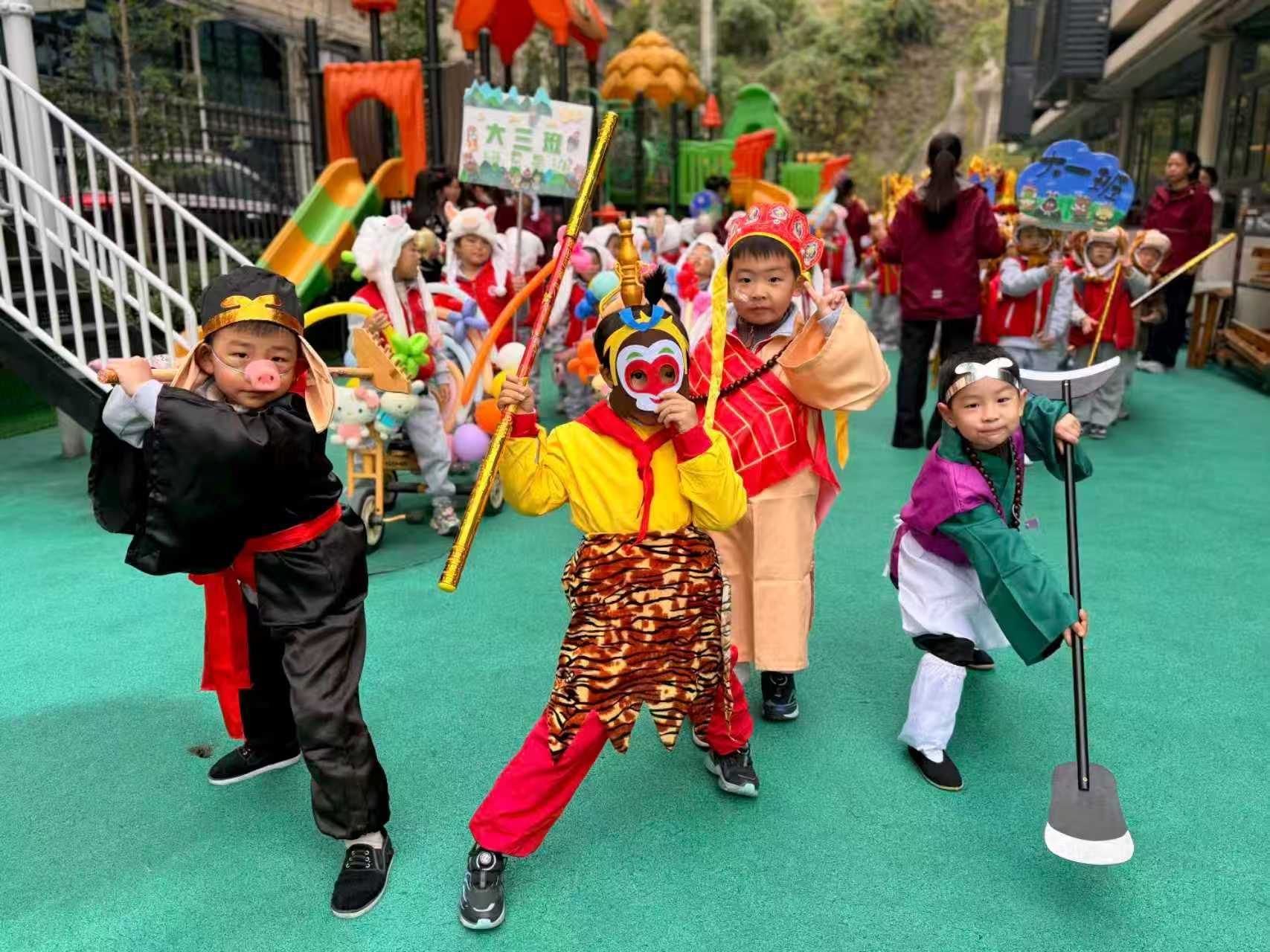 本网讯 12月5日,东坪紫薇谷幼儿园“翻滚吧·浪浪山小萌兽”亲子运动会在园所大操场热闹启幕。全园师幼与家长化身“浪浪山动物家族”,更有萌娃扮成齐天大圣、猪八戒等经典角色惊艳亮相,携手开启了一场充满活力与温情的运动之旅。 上午9时08分,开幕式正式拉开帷幕。激昂的音乐中,教师代表手持红绸奋力奔跑完成红旗接力,点燃全场热情;萌娃们身着齐天大圣、猪八戒等特色装扮列队入场,整齐的步伐、响亮的口号尽显蓬勃朝气。升国旗、园长致辞、家长与幼儿代表发言后,全场亲子共同进行运动宣誓,将“坚持勇敢、快乐同行”的理念深植心中。