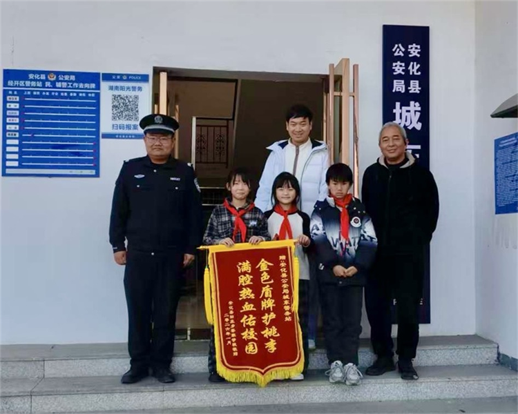 本网讯 1月9日,在第六个“中国人民警察节”即将到来之际,为表达对长期以来坚守“护学岗”、守护师生安全的公安民警的崇高敬意和衷心感谢,茶家学校校长胡成才带领教师及学生代表,来到安化县公安局城东警务站,将一面绣有“金色盾牌护桃李,满腔热血佑校园”的锦旗送到了最可爱的“校园卫士”手中,在寒冬中上演了暖意融融的警民情深一幕。 少先队员代表为民警叔叔阿姨们致以标准的队礼。胡成才将承载着全校师生心意的锦旗郑重赠予派警务站领导,并动情地说:“无论刮风下雨、严寒酷暑,每天上下学时,我们总能看到民警同志挺拔的身影。他们疏导交通、护卫学生、处置突发,用坚实的肩膀为我们筑起了最安全的屏障。这面锦旗,代表了全体师生和家长发自内心的感谢!” 城东警务站民警接过锦旗并表示:“守护校园平安是我们的职责所在。这面锦旗是荣誉,更是责任。我们将一如既往地站好‘护学岗’,深化警校联动,为孩子们的健康成长保驾护航!” 红领巾与警徽相映生辉,锦旗虽轻,情谊厚重。在警察节这个特殊的日子里,这份来自校园的真诚致谢,诠释了“人民警察为人民”的深刻内涵,也谱写了一曲警校携手、共育未来的和谐乐章。(通讯员:谌乐平) 初审初校:谌乐平 复审复校:胡成才 终审终校:蒋洲洋