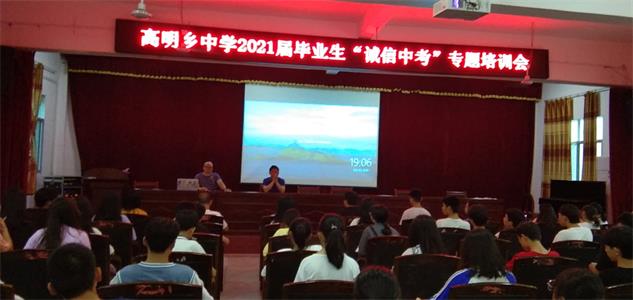 本网讯 6月14日晚,诚信中考专题培训会在高明乡中学举行。 2021年中考即将来临,为营造“诚信、公平、公正“的考试氛围,弘扬求真务实的学风,诚实认真地对待中考,高明乡中学切实抓好考前考纪考风教育活动。此前,八九年级各班召开了诚信考试主题班会,在班级家长群里发送了致家长公开信,以提高考生和家长“诚信应考,拒绝舞弊”的意识,达成规范考试行为,避免违纪行为的发生的共识。为巩固教育成效,该校集合八九年级全体考生,在学校大礼堂举办了本次考前专题培训会。 两个小时的培训会主要有三个方面的程序。首先组织同学们观看了诚信考试的专题视频,从国家法律和政策的高度学习中考规范,然后教导处主任谭春松组织学习了中考安检和考试规则,最后由该校校长杨成才作了“诚实做人,诚信中考”的主题讲座。 活动结束环节,全体考生举行了“诚信中考”宣誓并签署了《诚信考试承诺书》。 (通讯员 高飞跃)
