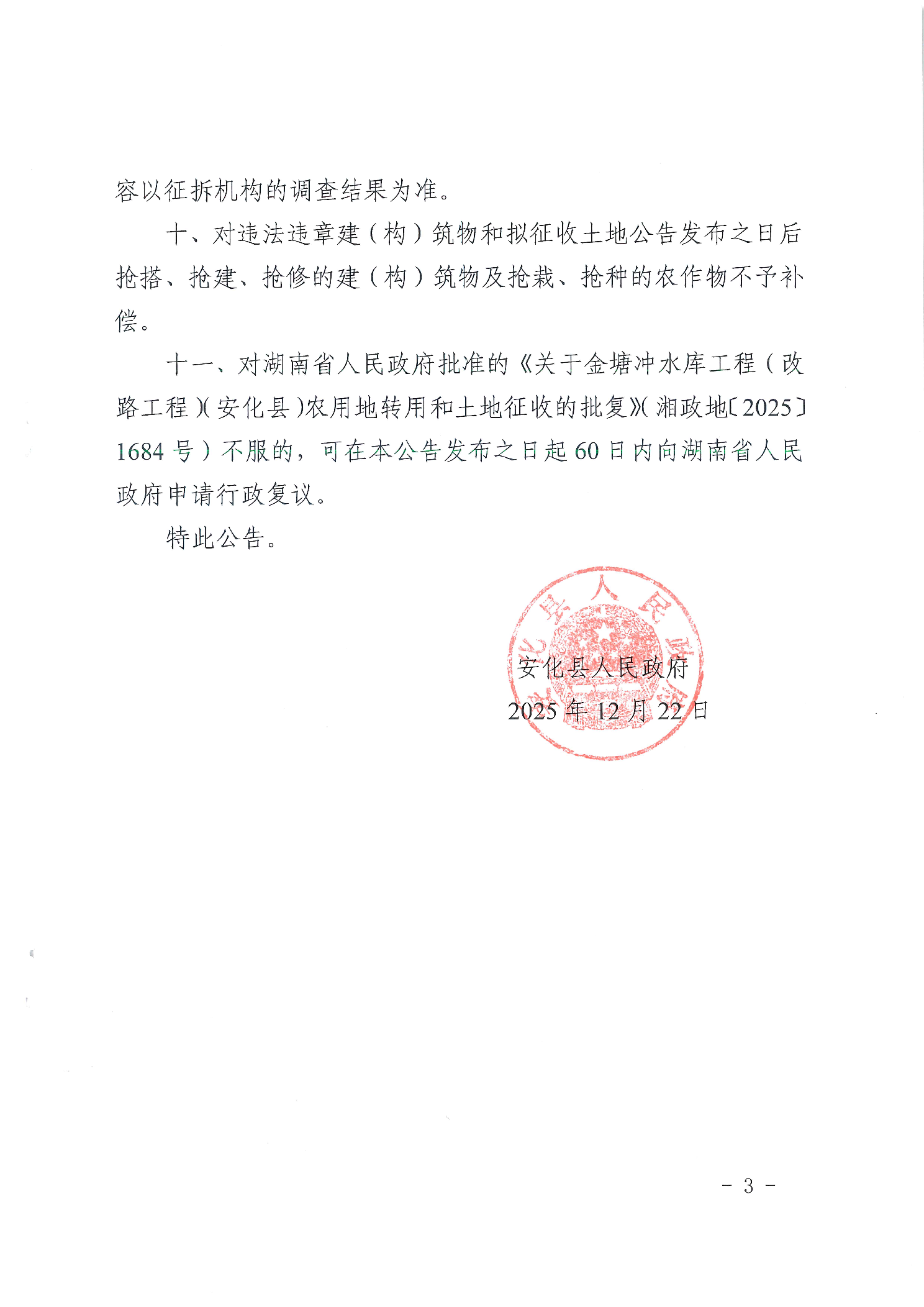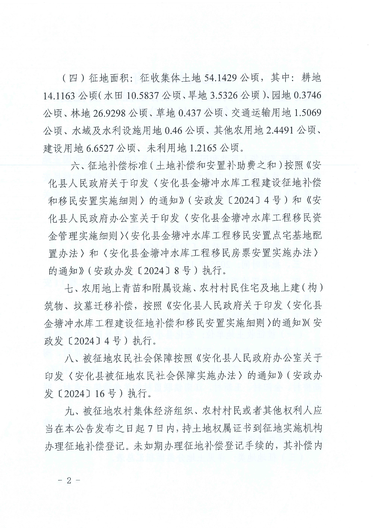 关于金塘冲水库工程(改路工程)(安化县)征收土地的公告