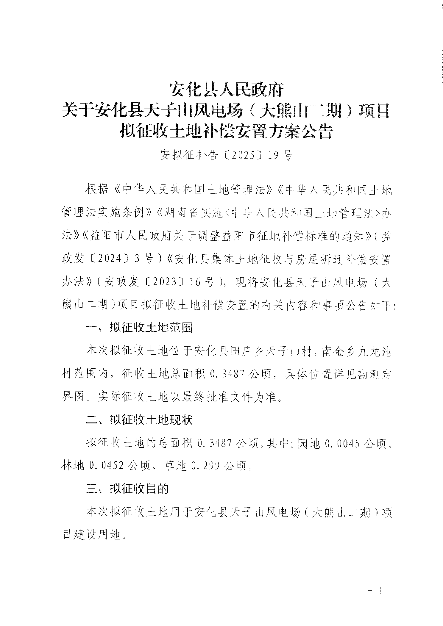 关于安化县天子山风电场(大熊山二期)项目拟征收土地补偿安置方案公告
