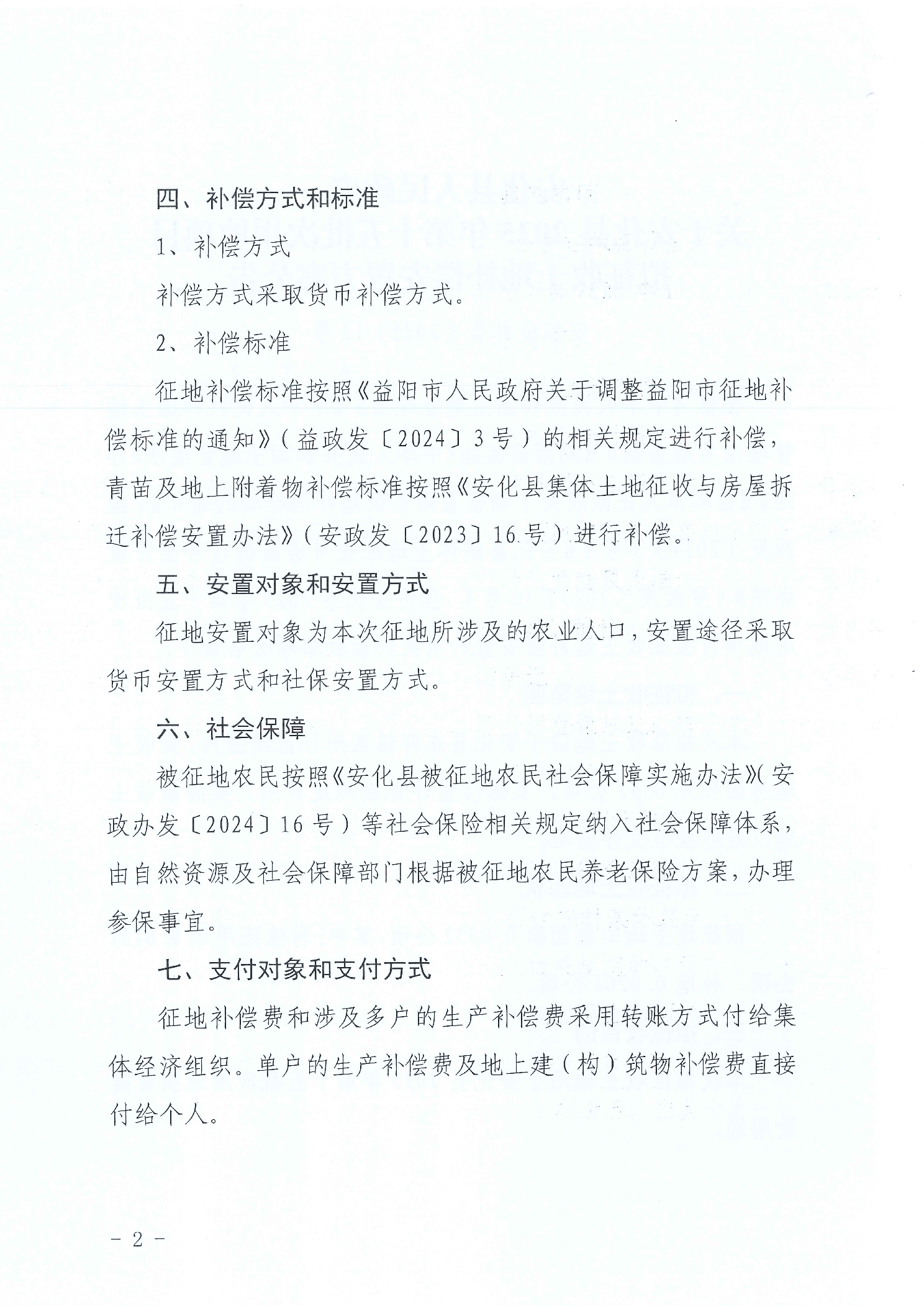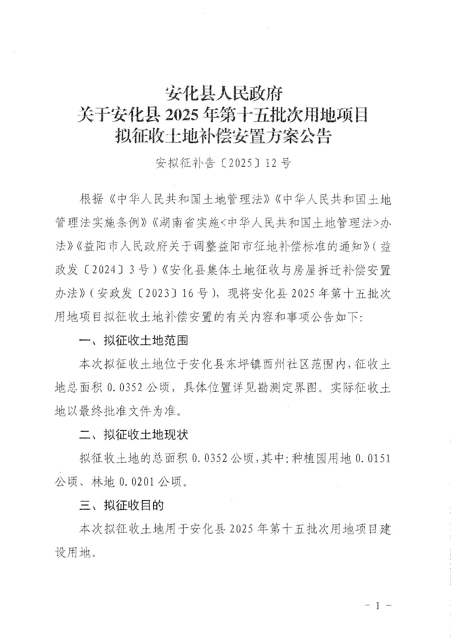 关于安化县2025年第十五批次用地项目拟征收土地补偿安置方案公告