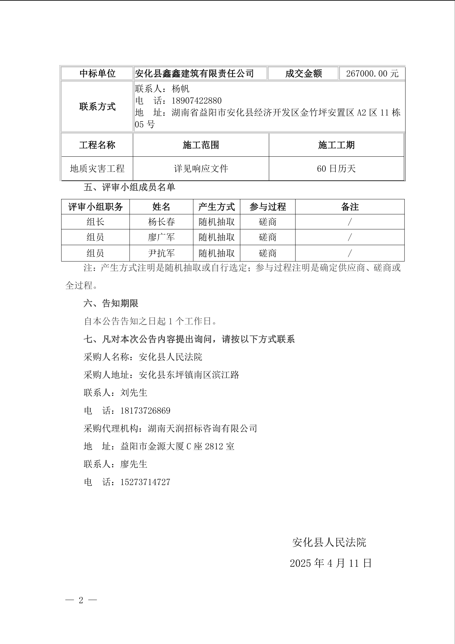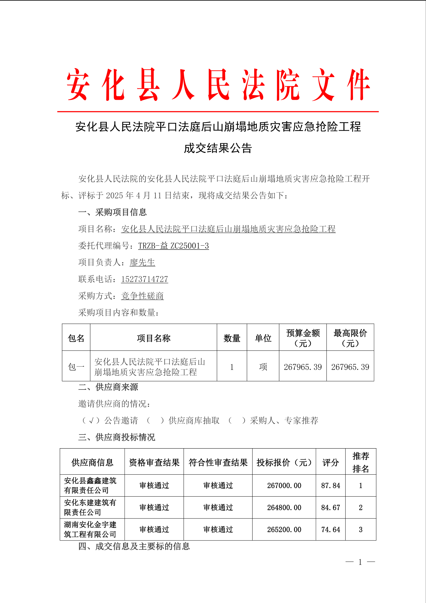 安化县人民法院平口法庭后山崩塌地质灾害应急抢险工程成交结果公告
