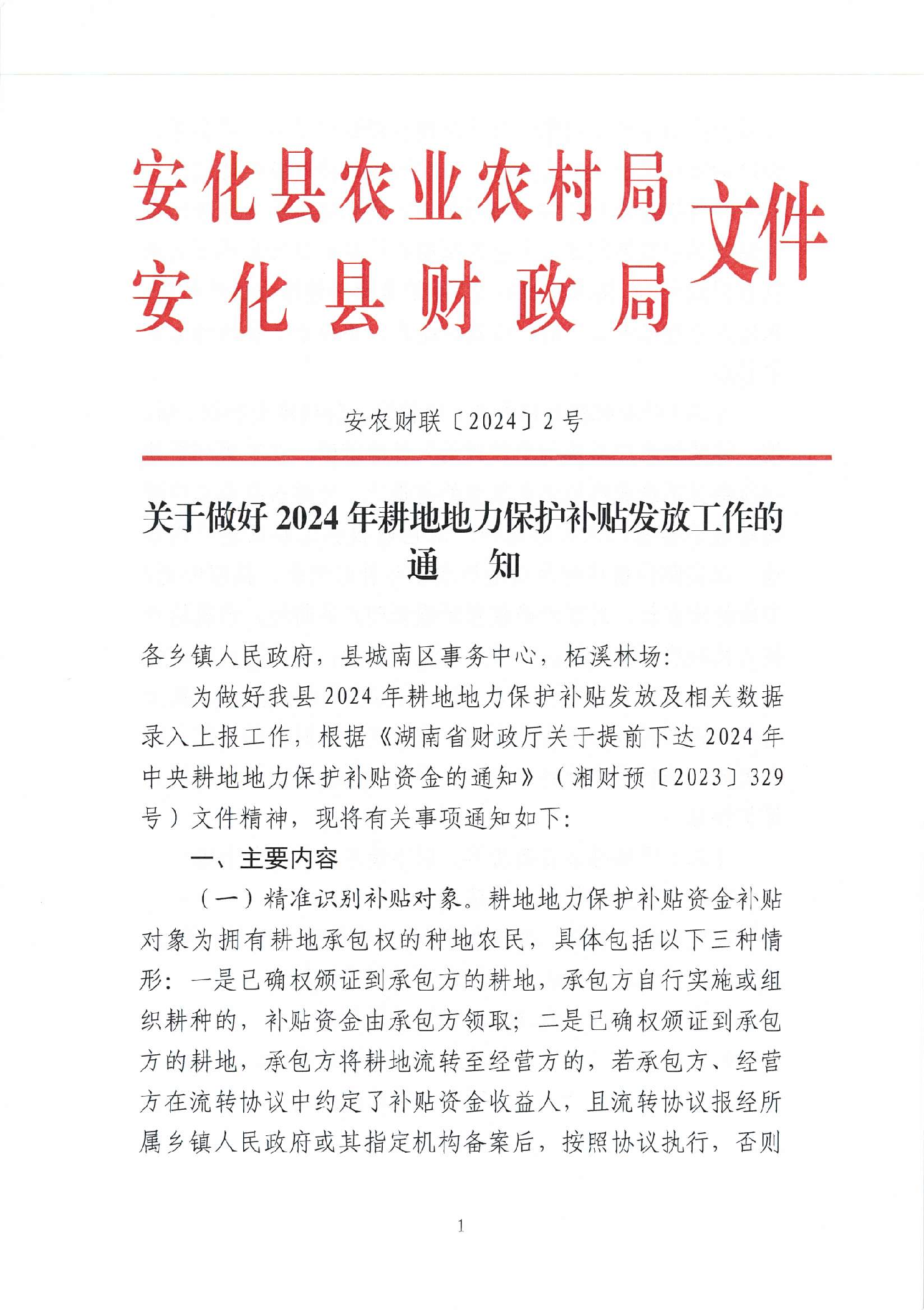 安化县农业农村局 安化县财政局关于做好2024年耕地地力保护补贴发放工作的通知 安农财联〔2024〕2号
