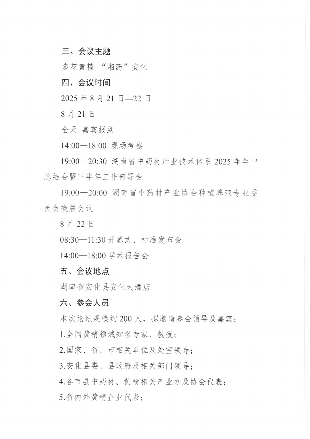 为了确保服务质量,提高接待水平,请务必于8月12日前将参会回执表反馈至会务组,会场名额有限,主营黄精产业的同仁优先,每家单位只限1人参加,报满即止;回执表由会务组确认后,将通过电子邮件、短信或微信等方式通知是否报名成功。