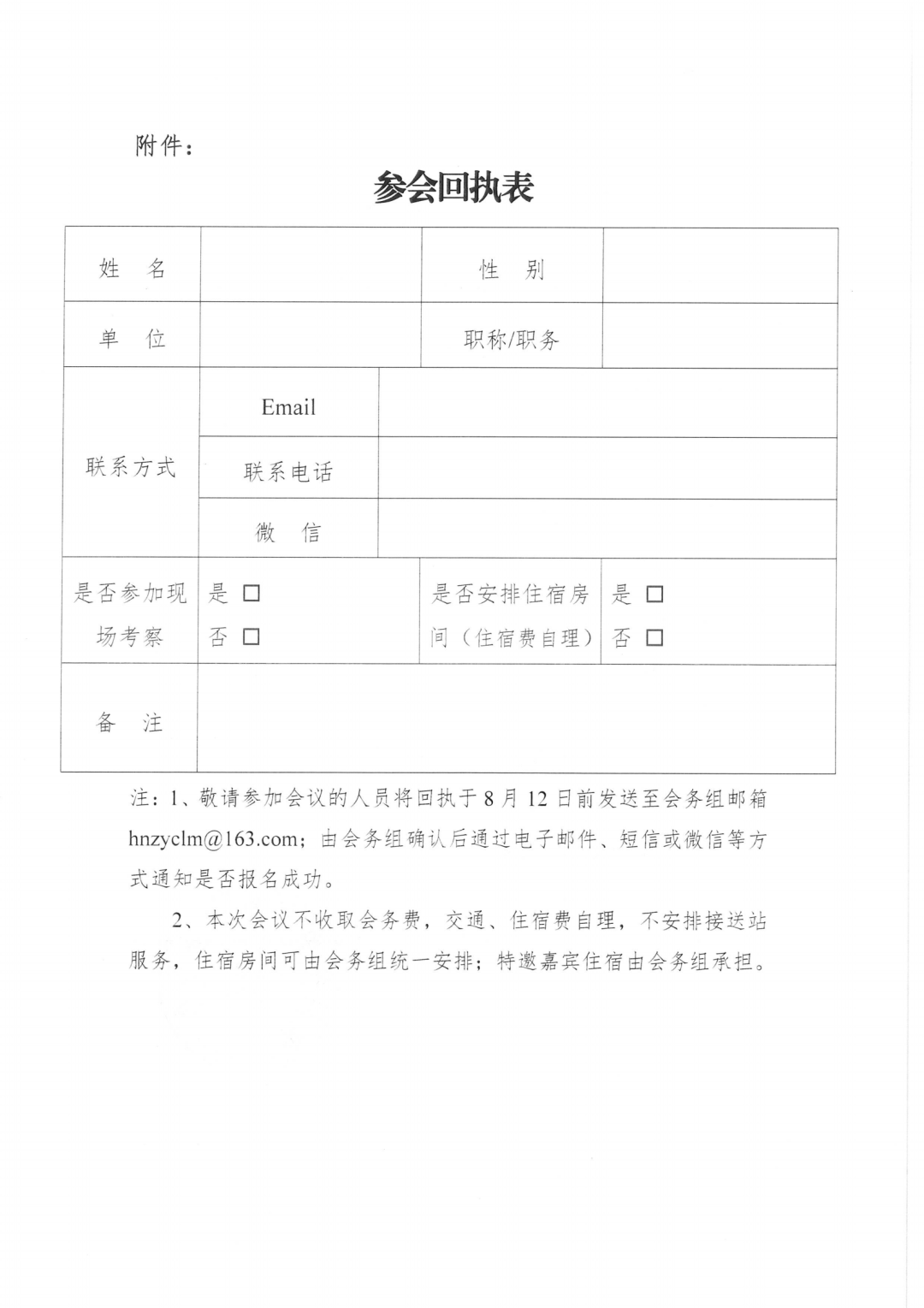 本次会议不收取会务费,交通、住宿费自理,不安排接送站服务,住宿房间可由会务组统一安排;特邀嘉宾住宿由会务组承担。参会回执见附件。