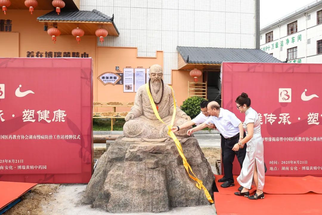 安化融媒8月21日讯(全媒体记者 吴思仪 阮波 摄影 李若妍)8月21日,以“雕传承,塑健康”为主题的“梅山医祖嚣嚣禅师塑像揭幕暨中国医药教育协会湖南慢病防治工作站授牌仪式”在中国安化·博瑞黄精中药园举行。活动旨在弘扬传统中医药文化,推动慢病防治体系建设,助力“健康中国”战略在湖南落地生根。中国医药教育协会荣誉会长,国际生态生命安全科学院副主席、中国分院主席,院士黄正明参加活动。中国医药教育协会常务副会长、党支部书记、中国医药教育协会慢病防治工作总站站长杨清仁参加活动。