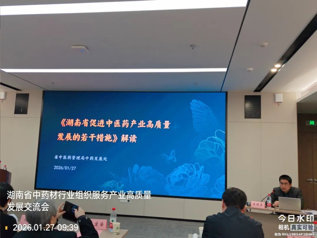 会上,湖南省中医药管理局中药发展处处长王颖异、湖南省社会组织促进会副秘书长陈小勇分别围绕我省中药材产业发展政策、社会组织管理政策进行深入解读;中国中药协会中药材种植养殖专业委员会副主任委员兼秘书长曹海禄、省中药材协会秘书长杨子墨、怀化市中医药产业链办公室副主任杨黎、安化县中医药健康产业发展服务中心主任刘勇、新化县中药材协会顾问谢建辉结合自身工作实践作经验分享;湖南会展集团有限责任公司党委书记、董事长马永忠作2026中药农业博览会推介;湖南省气象局和澧县、桂阳、隆回中药材主管部门作交流发言和产业宣传。