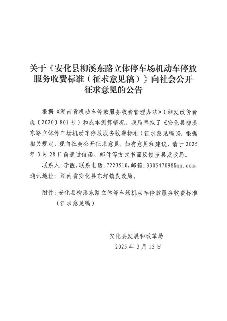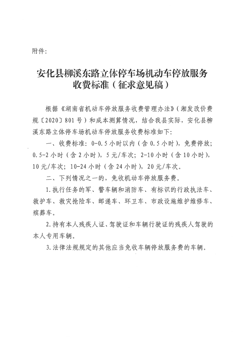 关于《安化县柳溪东路立体停车场机动车停放服务收费标准(征求意见稿)》向社会公开征求意见的公告