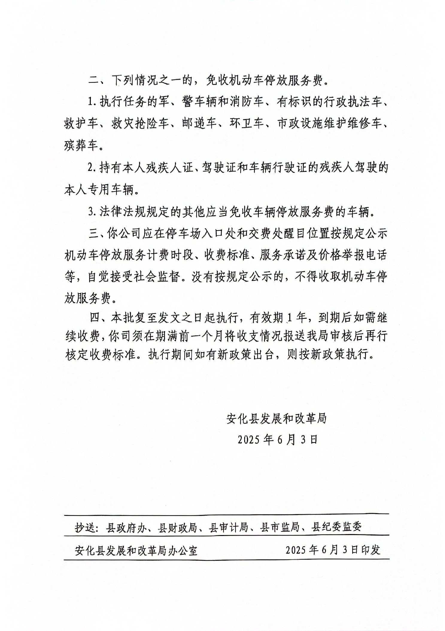 关于安化县城北区棚改地块临时停车场机动车停放服务临时收费标准的批复
