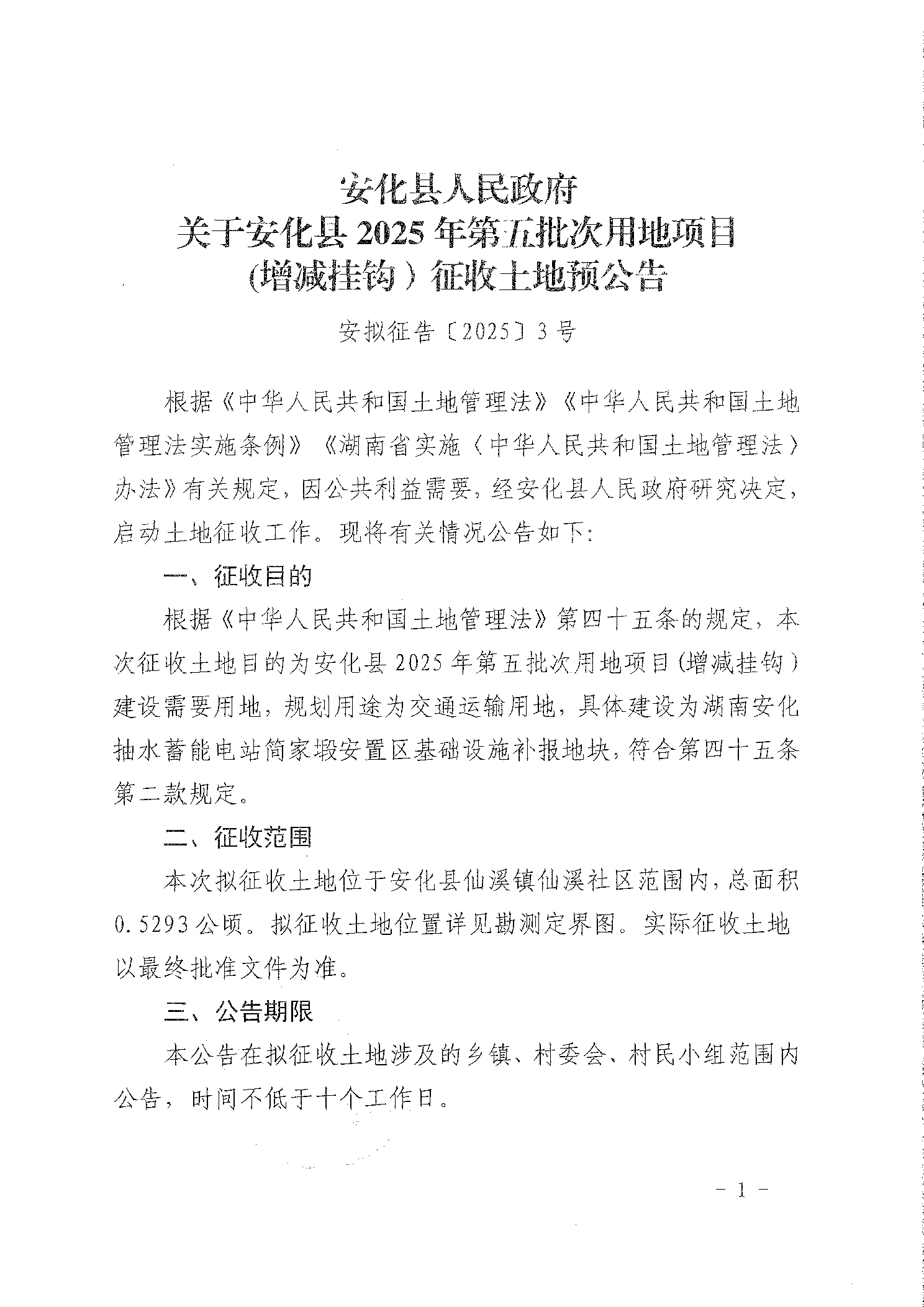 关于安化县2025年第五批次用地项目(增减挂钩)征收土地预公告