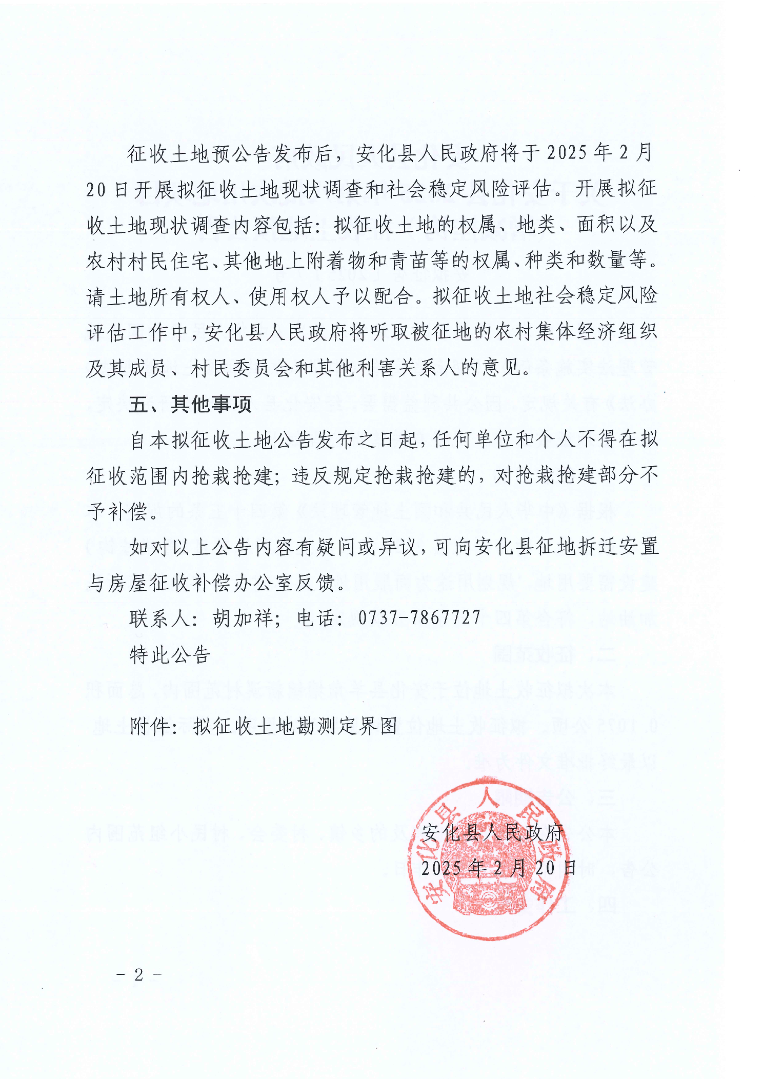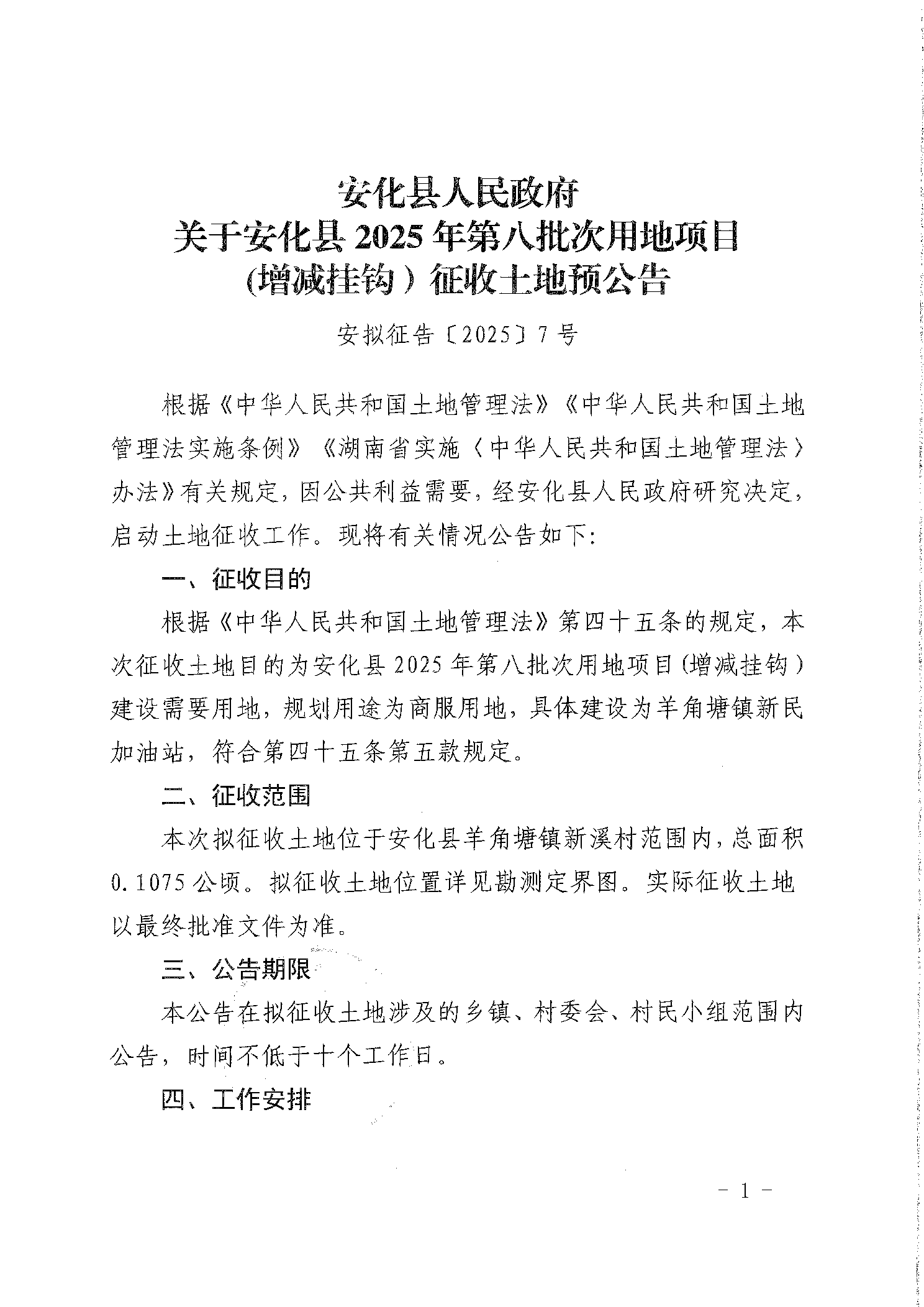 关于安化县2025年第八批次用地项目(增减挂钩)征收土地预公告