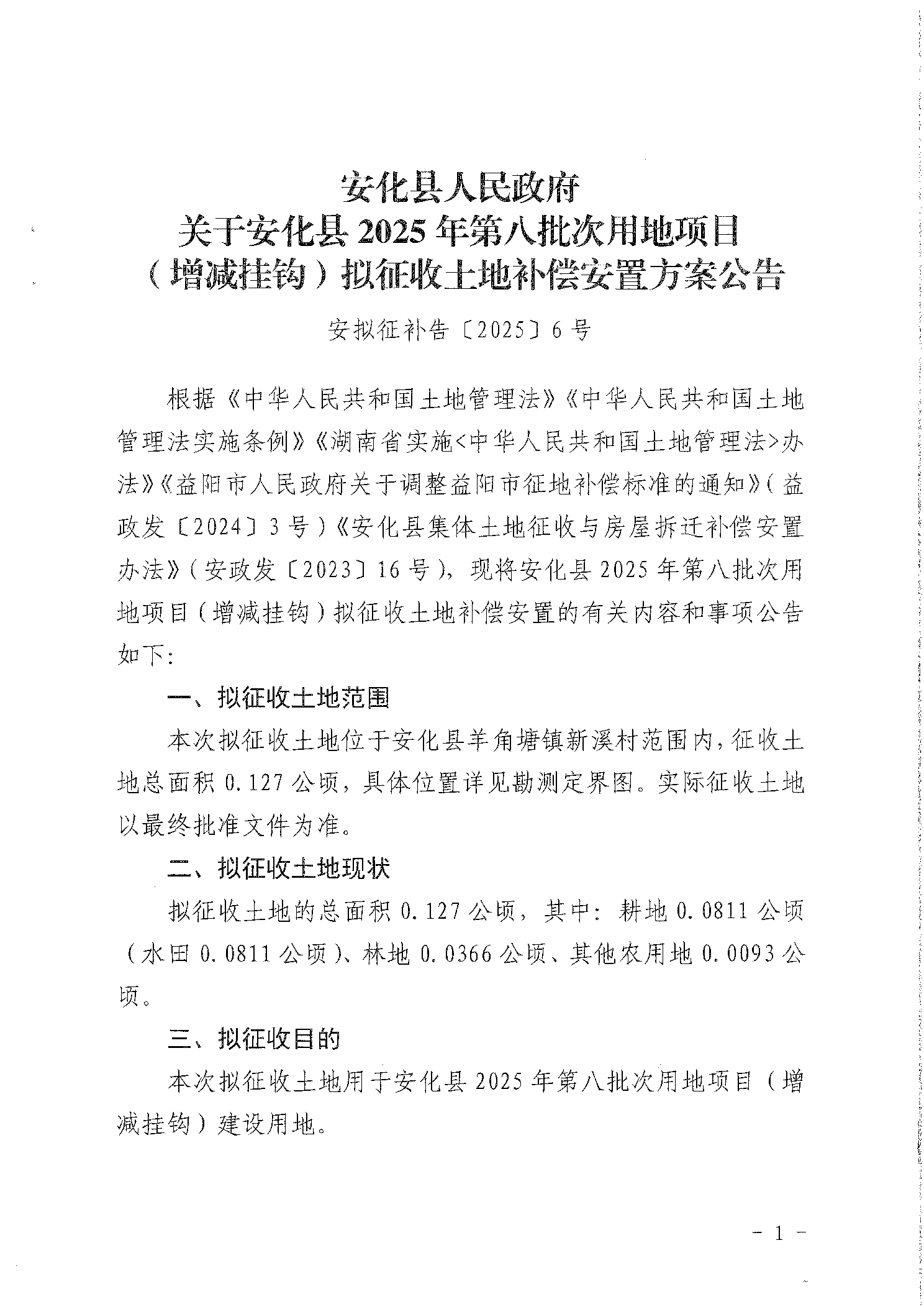 关于安化县2025年第八批次用地项目(增减挂钩)拟征收土地补偿安置方案公告