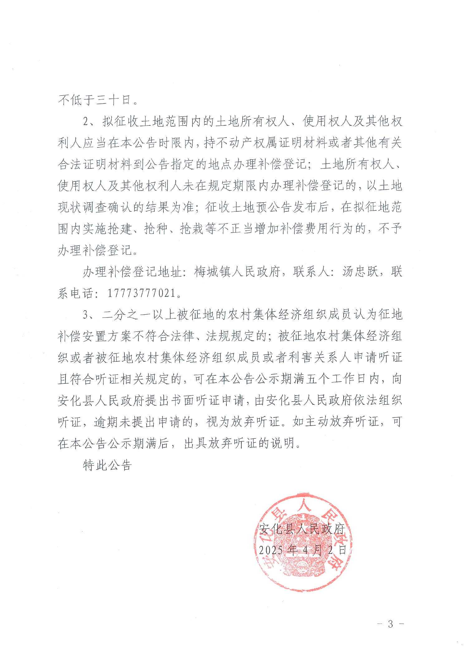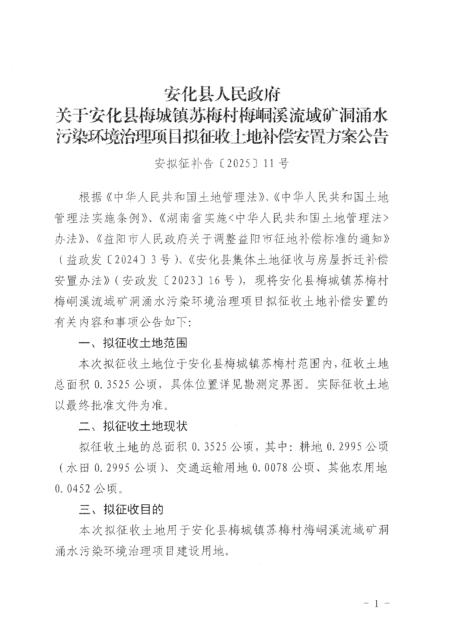 关于安化县梅城镇苏梅村梅峒溪流域矿洞涌水污染环境治理项目拟征收土地补偿安置方案公告