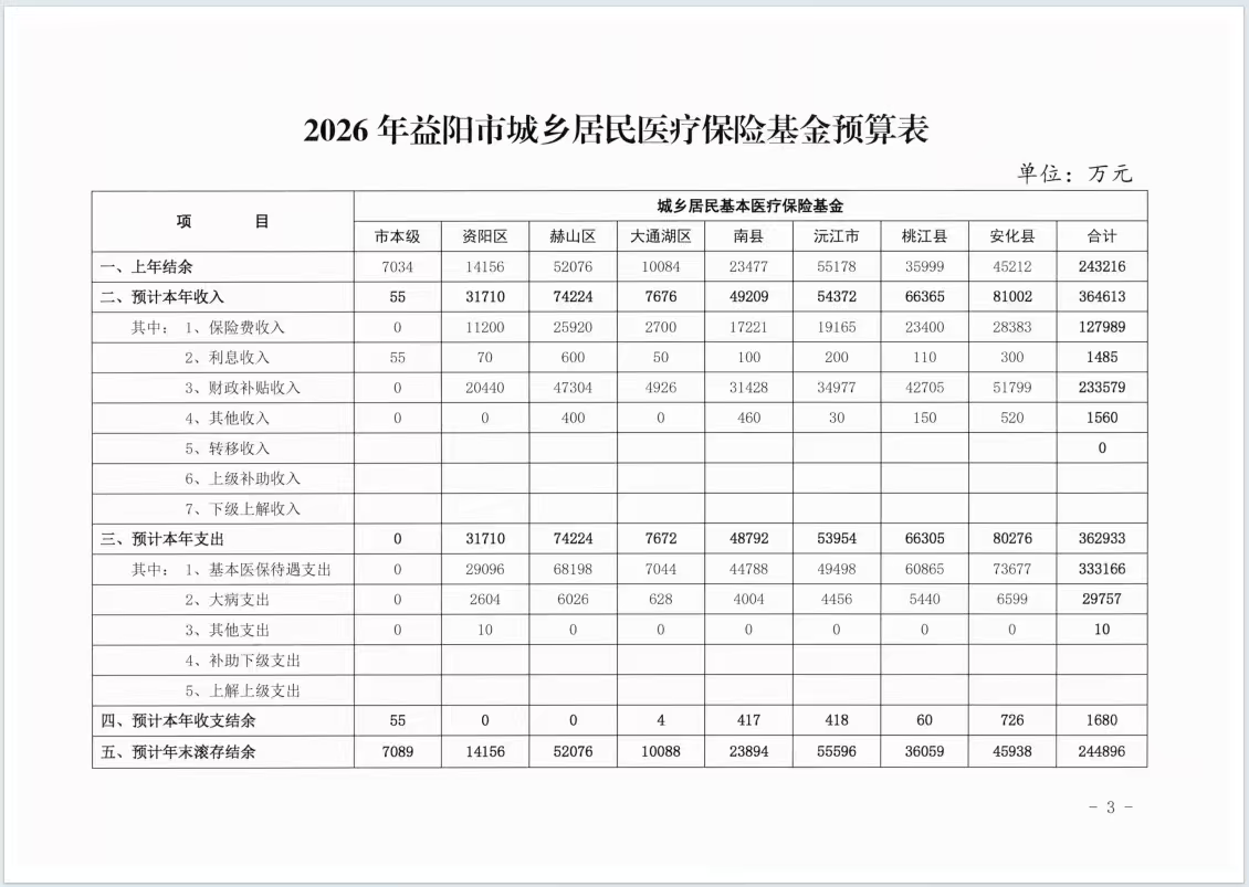 2026年益阳市城乡居民医疗保险基金预算表