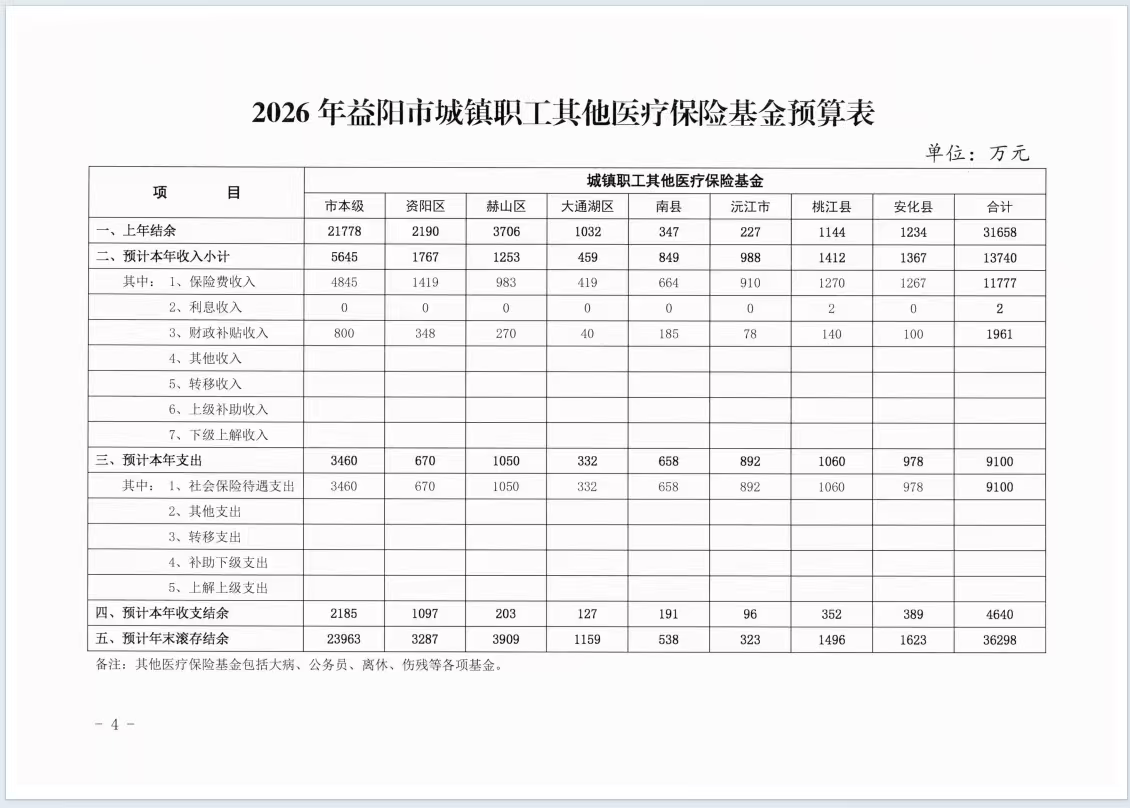 2026年益阳市城镇职工其他医疗保险基金预算表