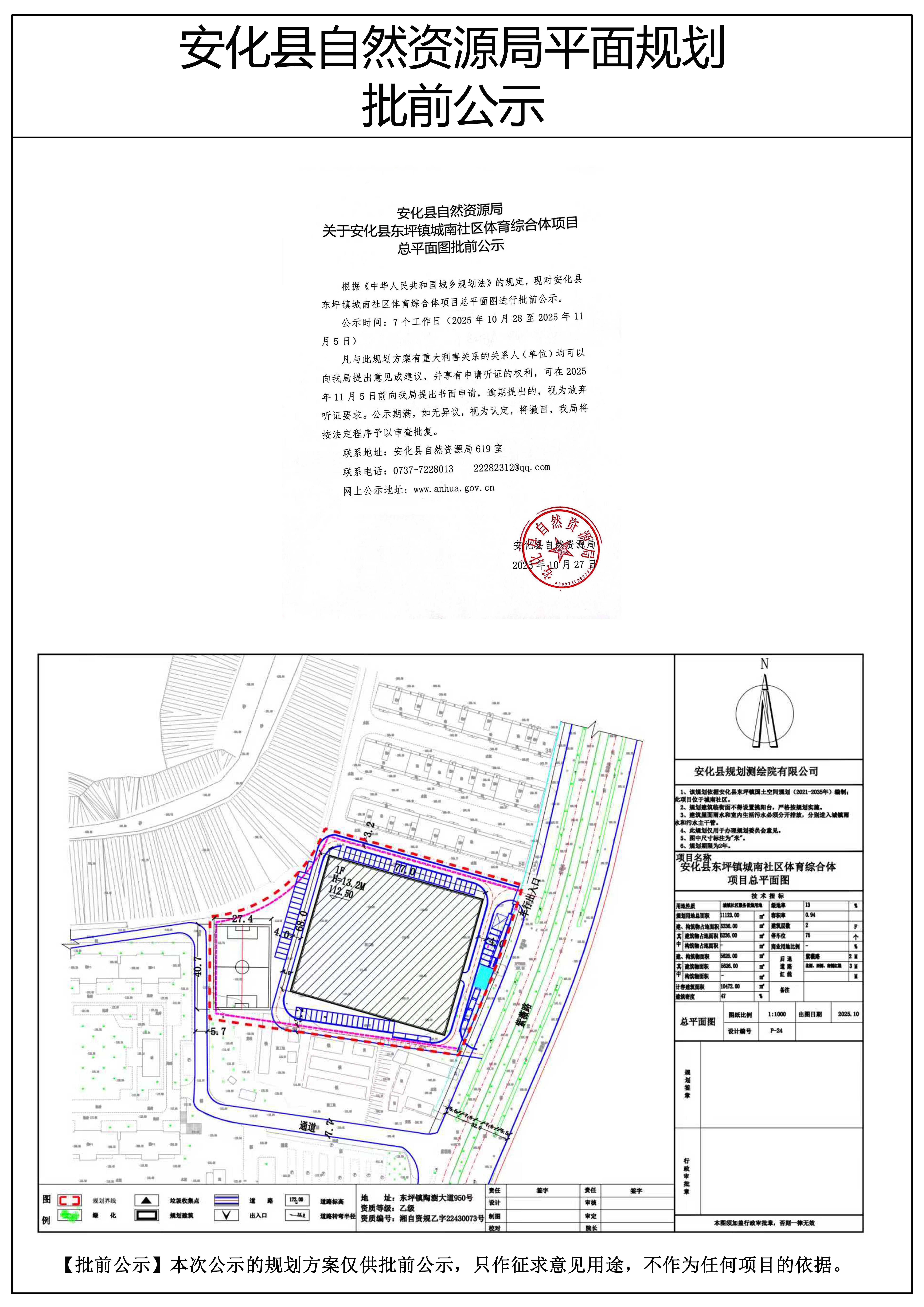 安化县东坪镇城南社区体育综合体项目总平面图批前公示