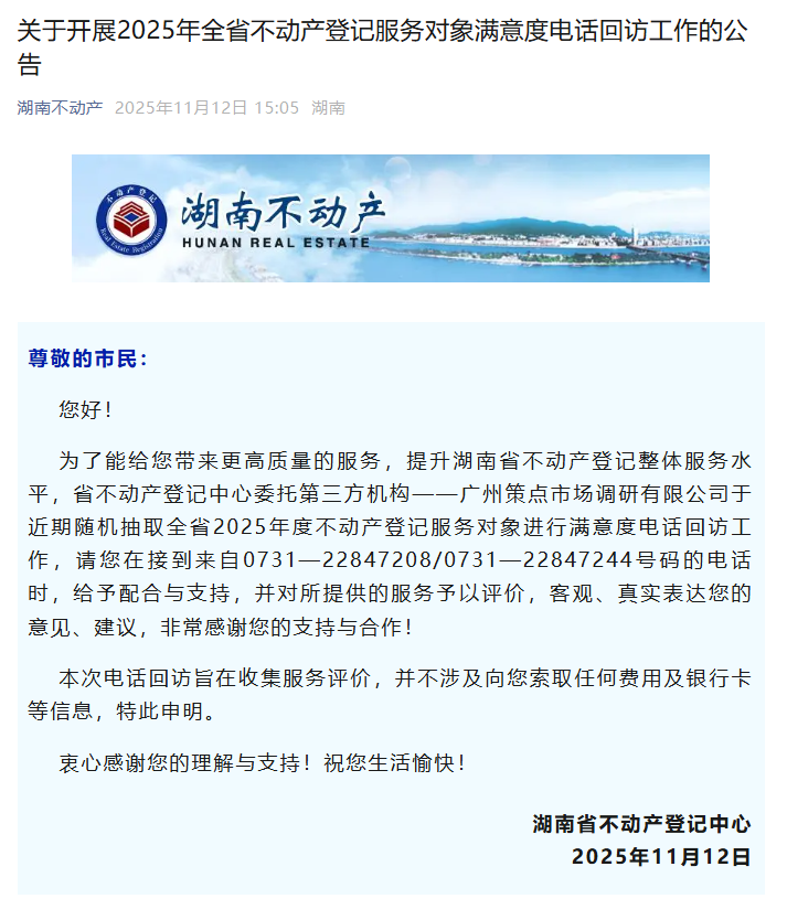 关于开展2025年全省不动产登记服务对象满意度电话回访工作的公告