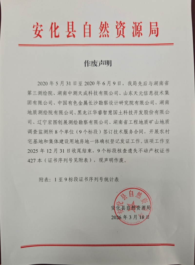 农村宅基地集体建设用地扫尾技术单位使用别的标段证书遗失公示 (20260316)427本