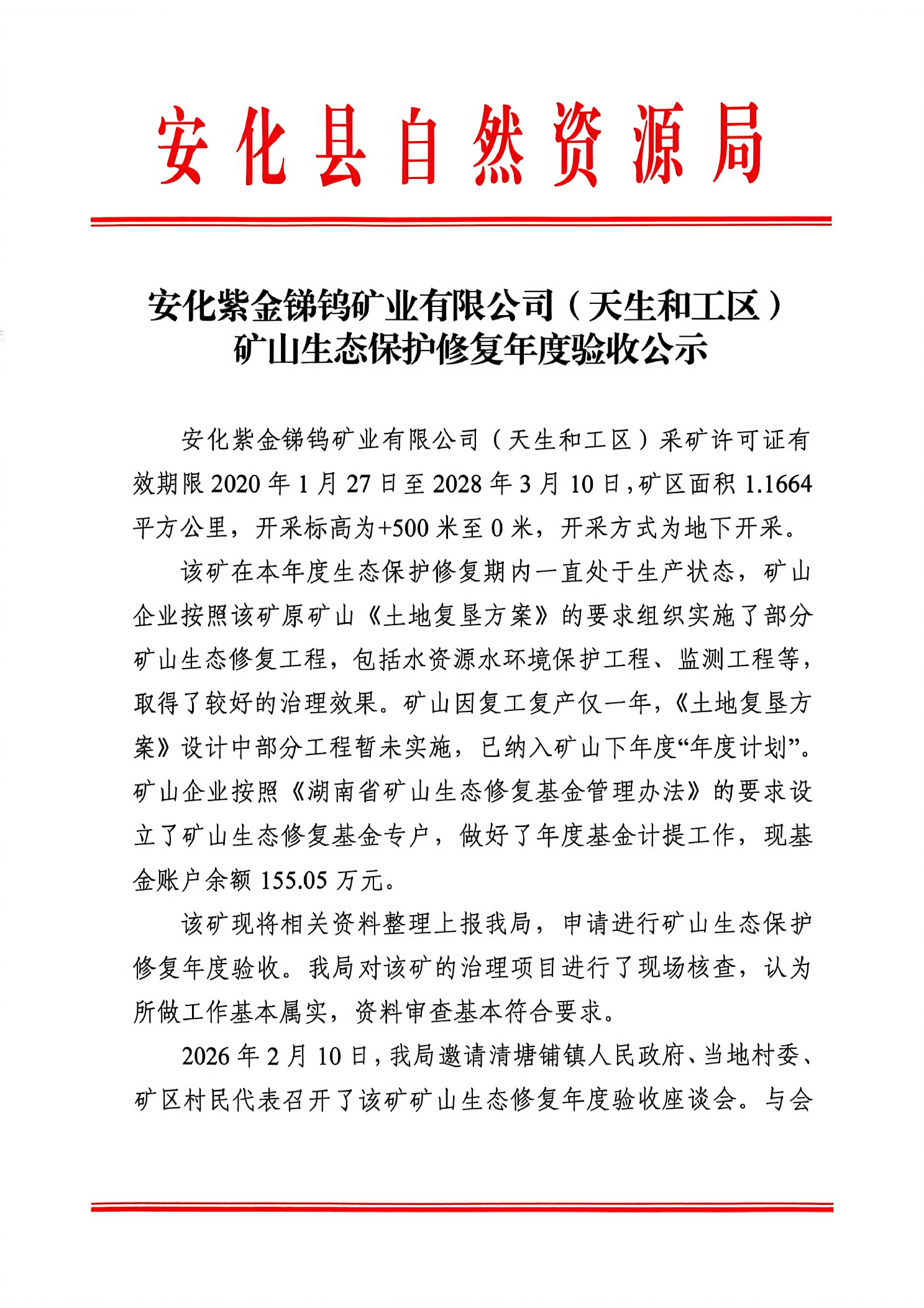 安化紫金锑钨矿业有限公司(天生和工区)矿山生态保护修复年度验收公示