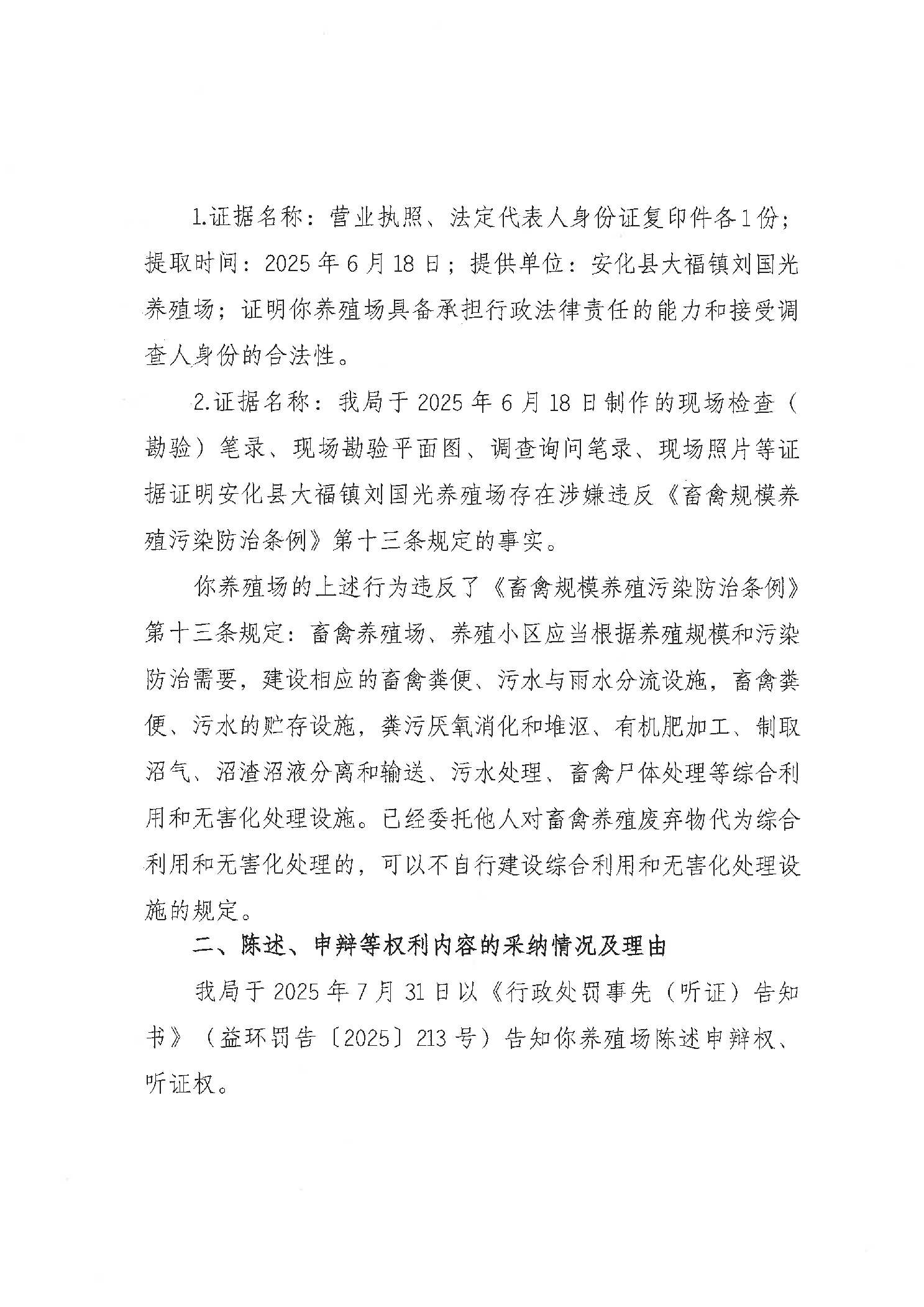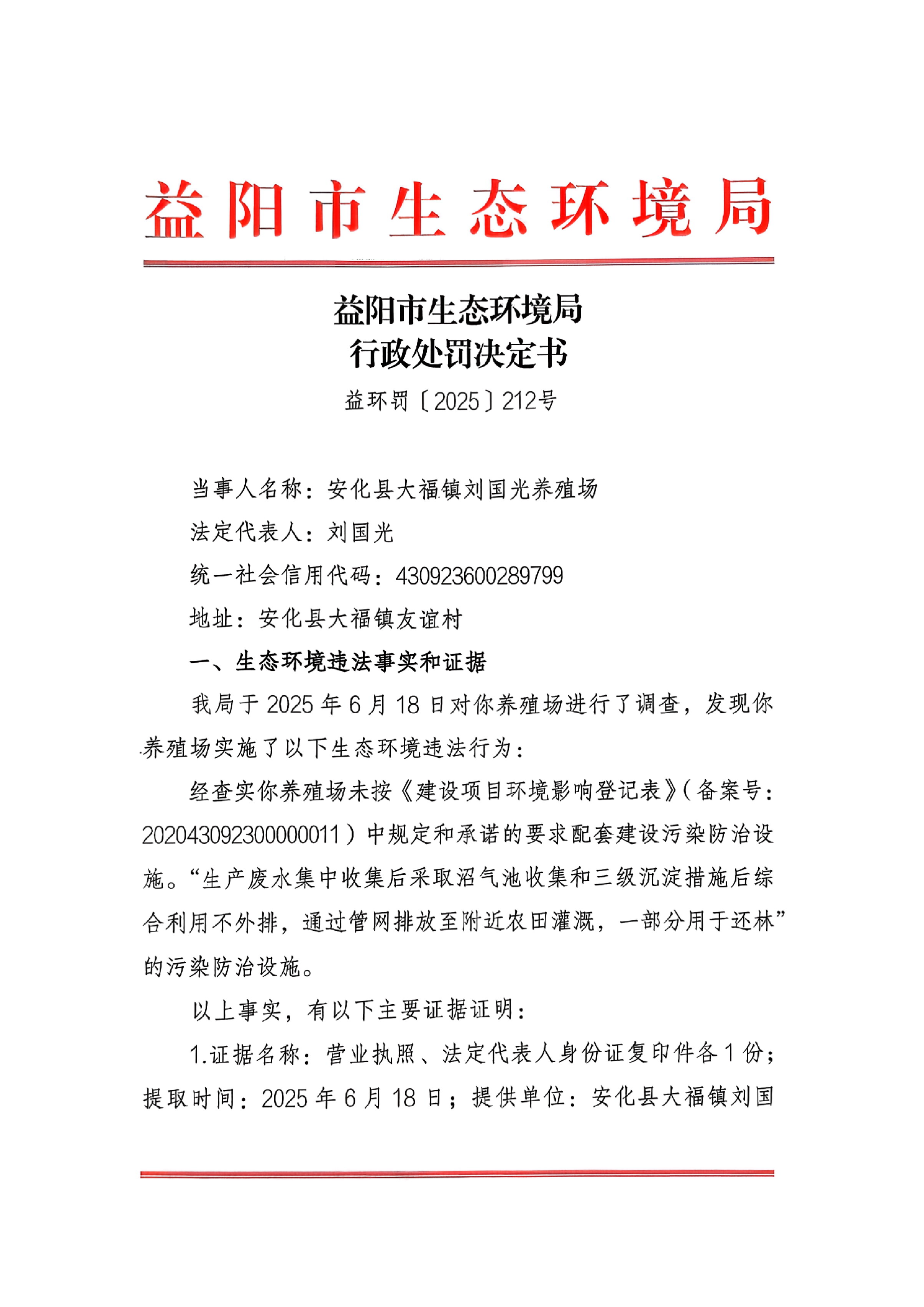 行政处罚决定书 益环罚字【2025】212号 安化县大福镇刘国光养殖场