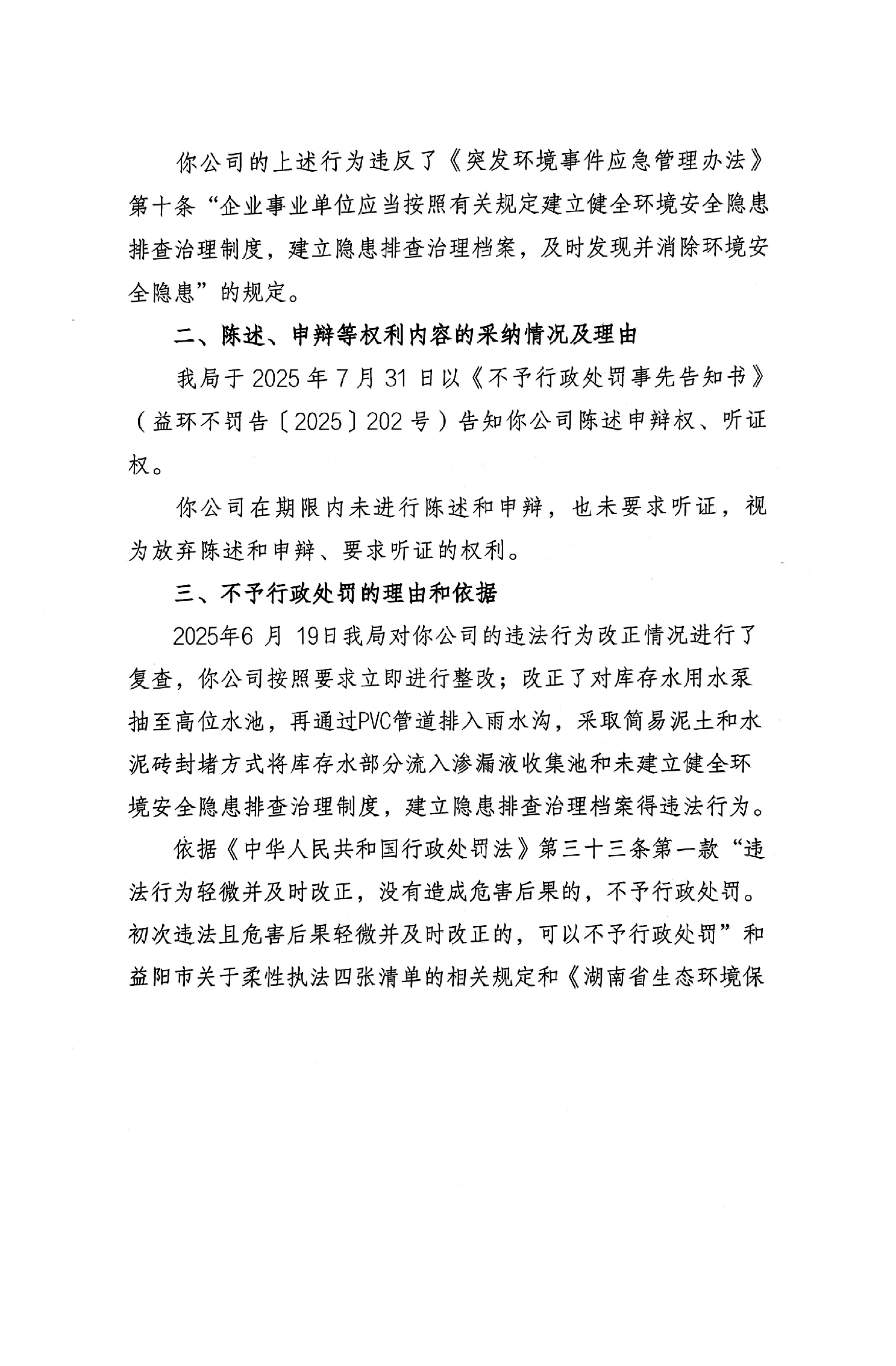 不予行政处罚决定书 益环不罚字【2025】202号 安化鑫丰矿业有限公司