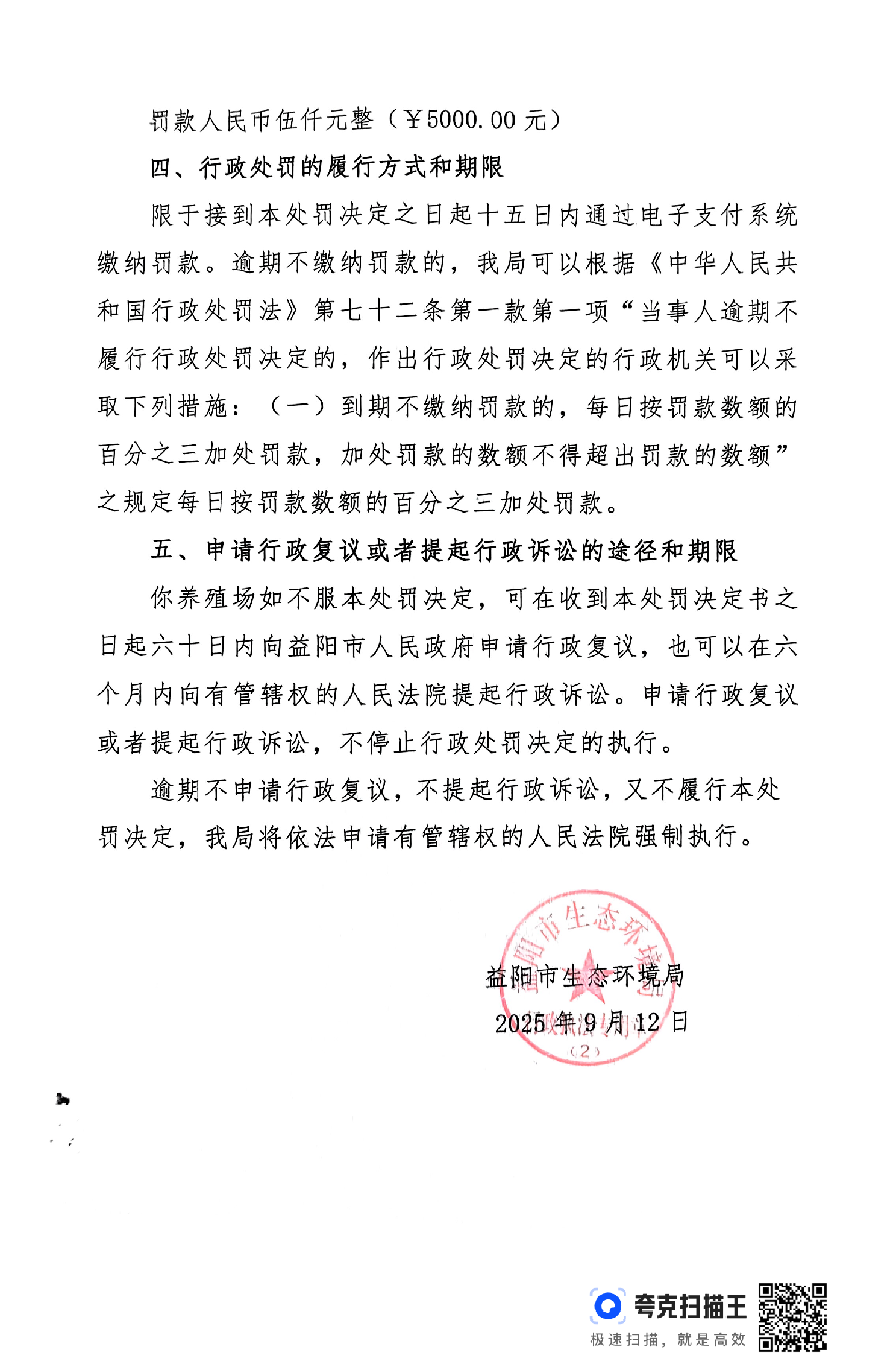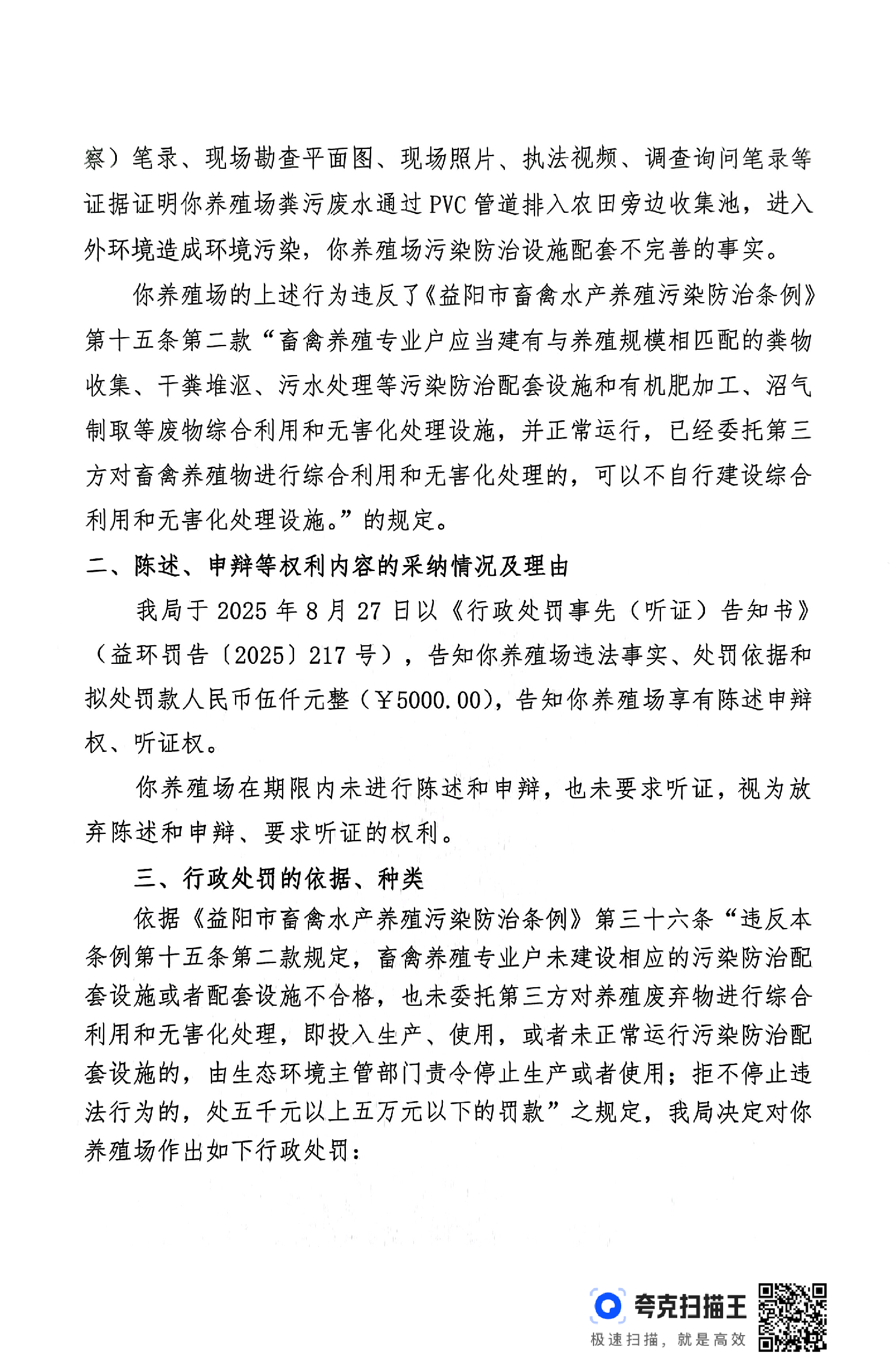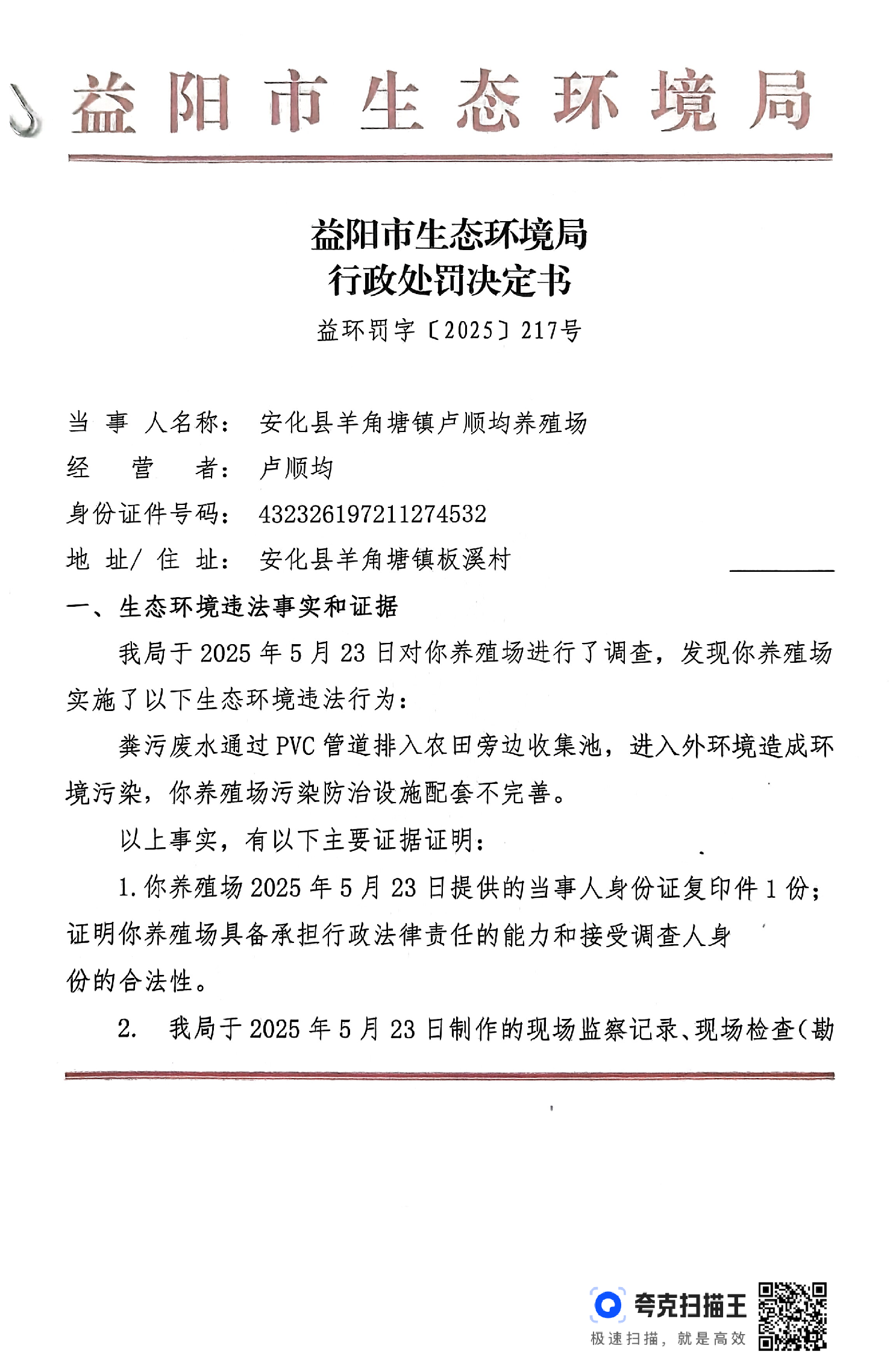 行政处罚决定书 益环罚字【2025】217号 羊角塘镇卢顺均养殖场