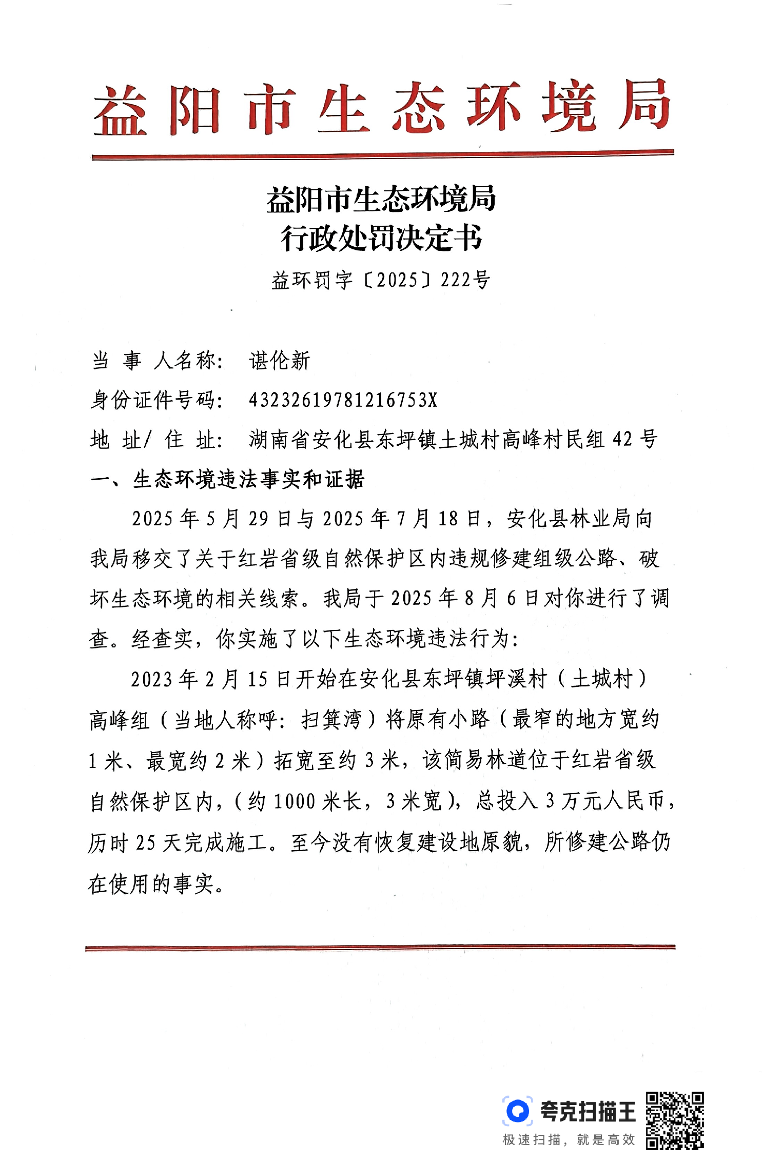 行政处罚决定书 益环罚字【2025】222号 谌伦新