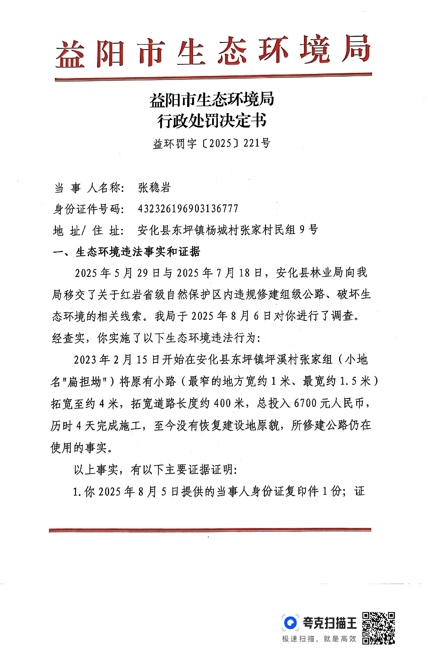 行政处罚决定书 益环罚字【2025】221号 张稳岩