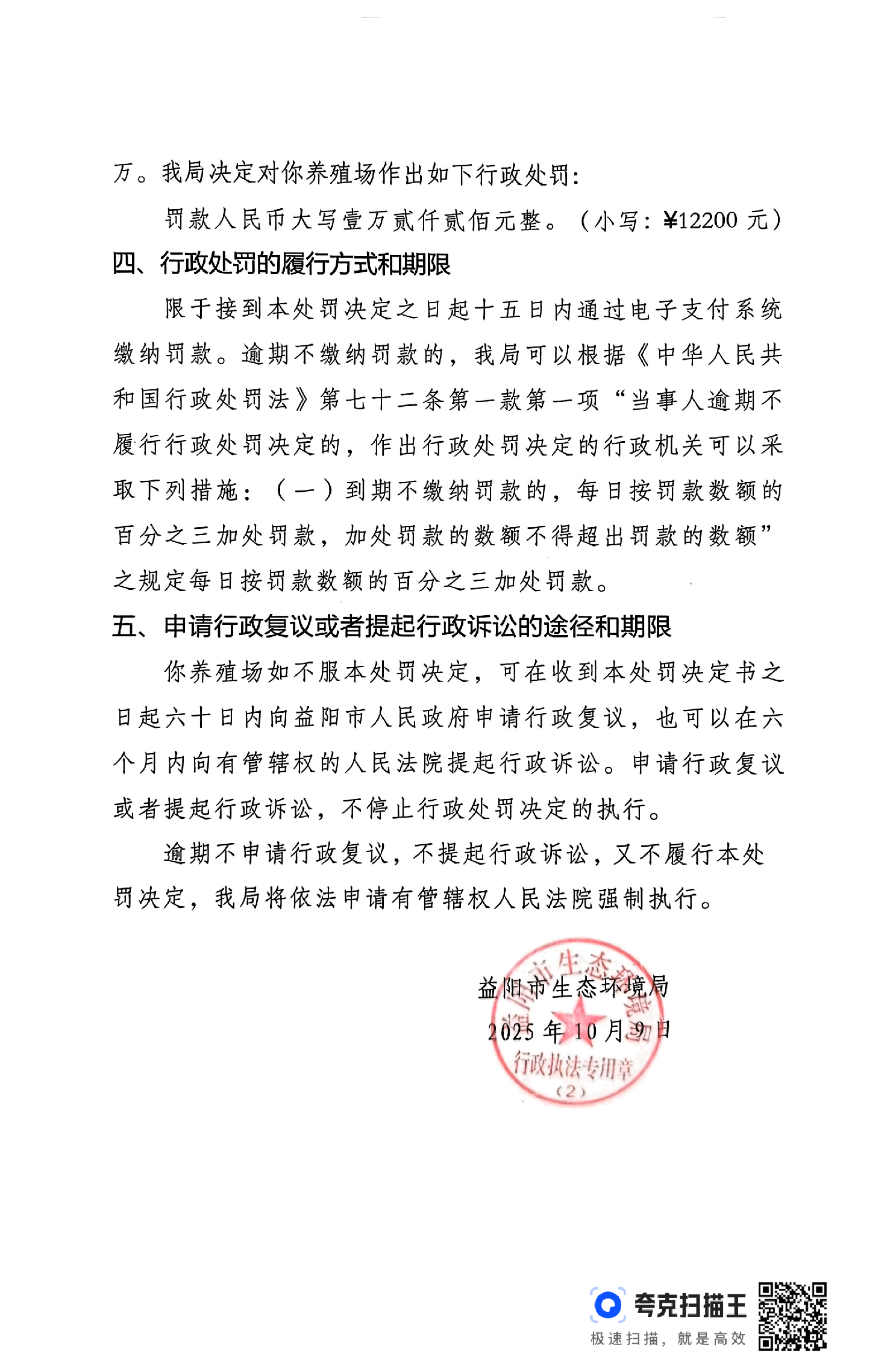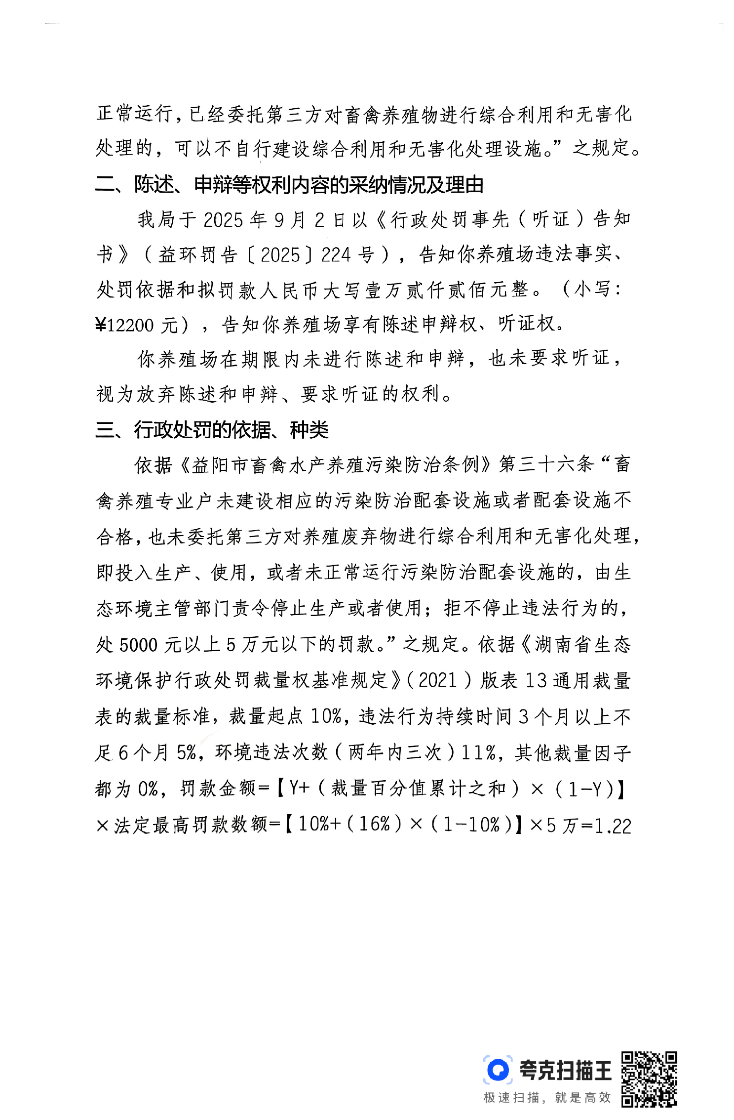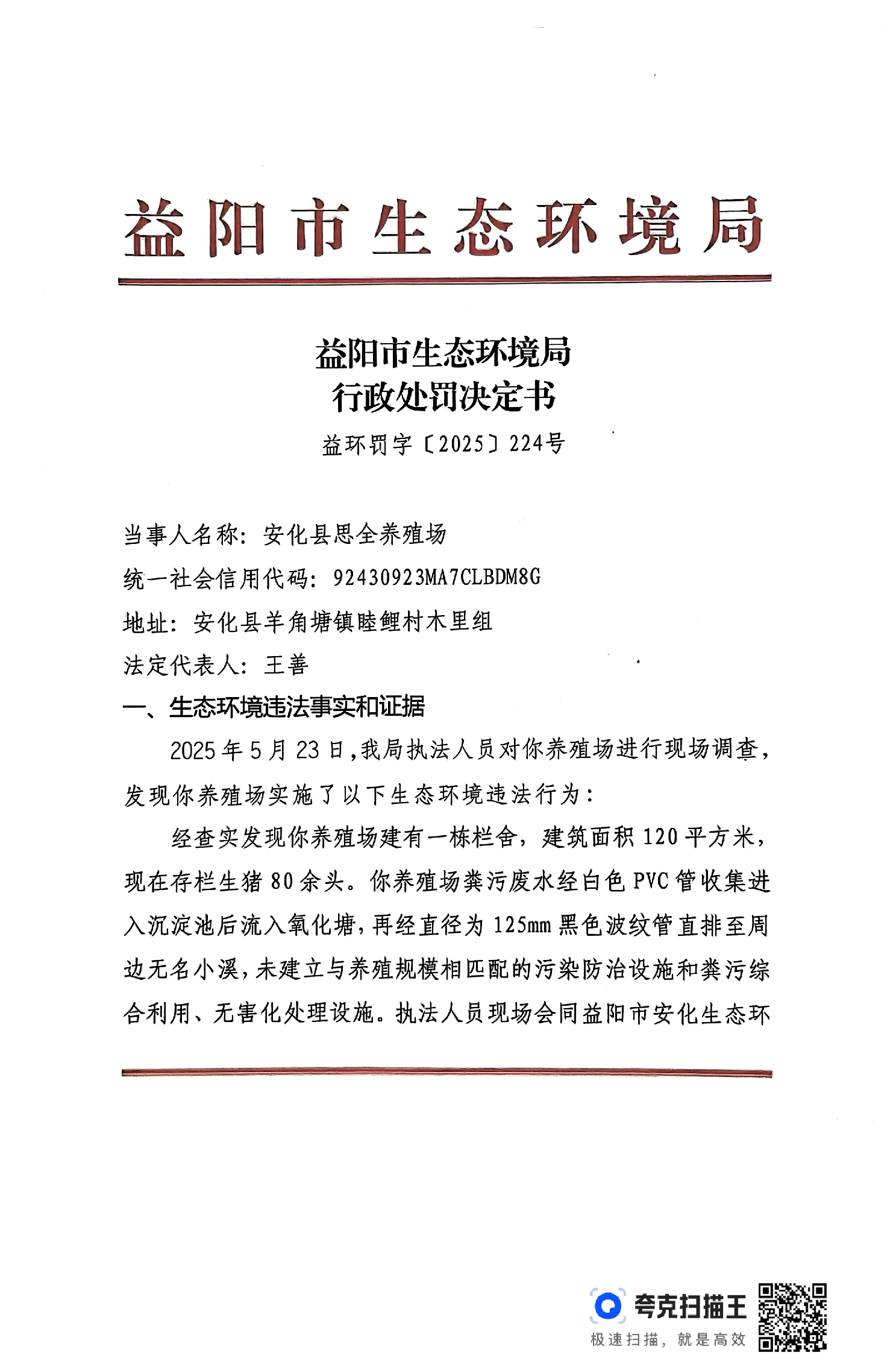 行政处罚决定书 益环罚字【2025】224号 安化县思全养殖场