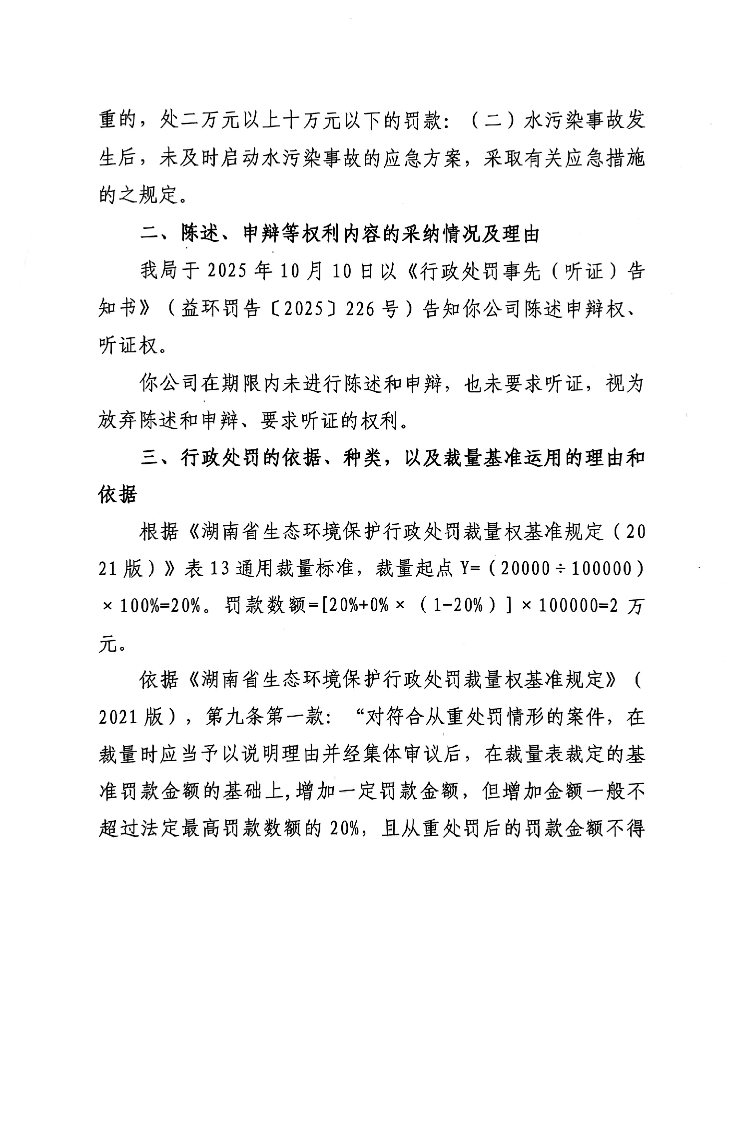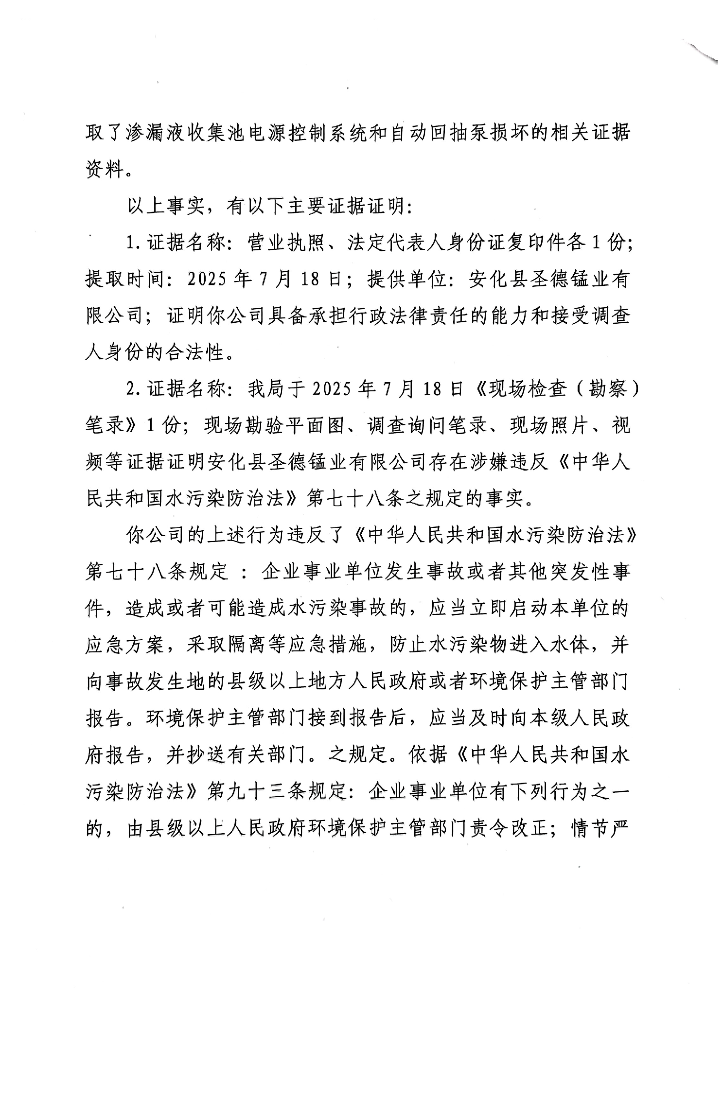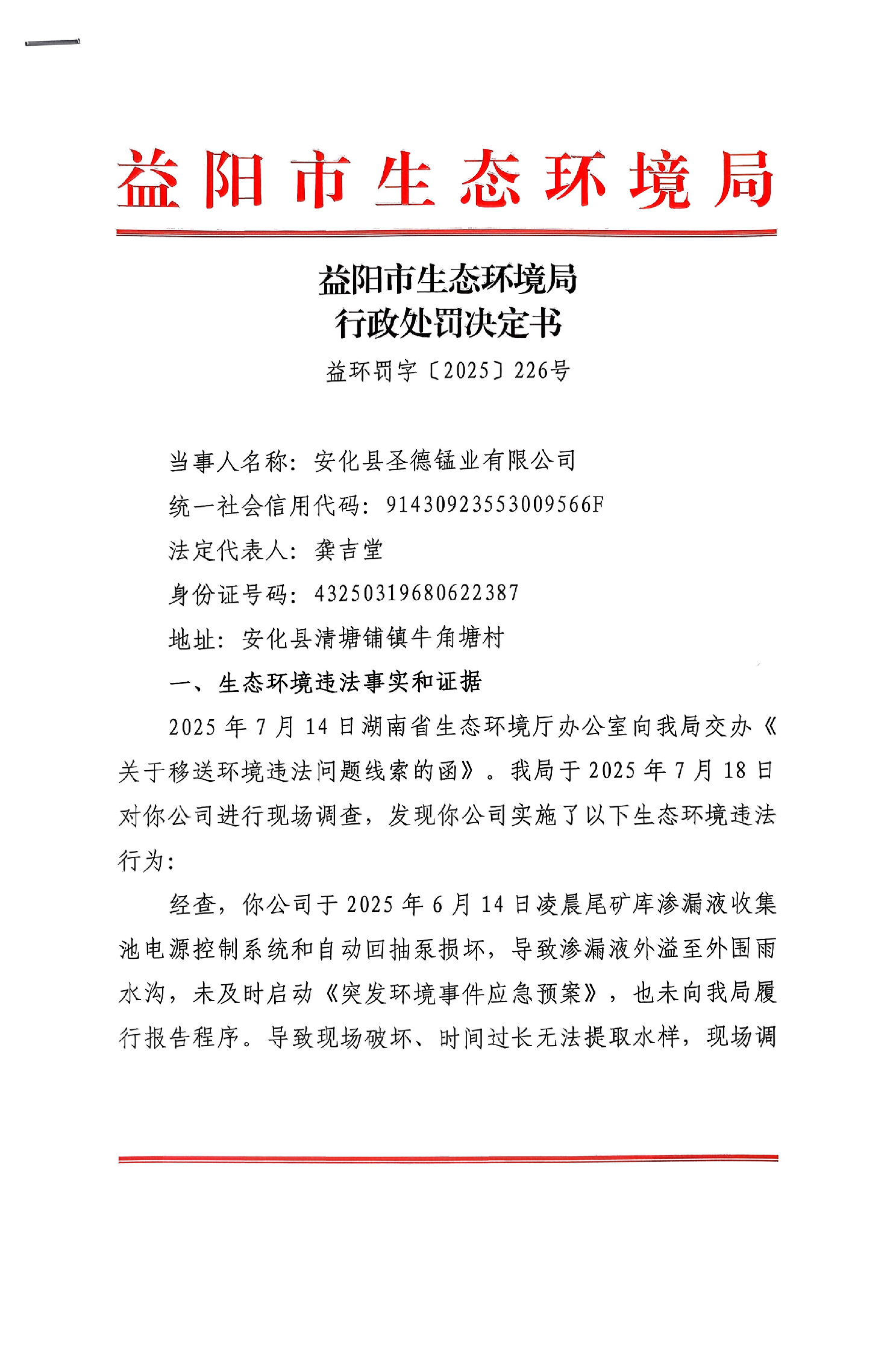 行政处罚决定书 益环罚字【2025】226号 安化县圣德锰业有限公司