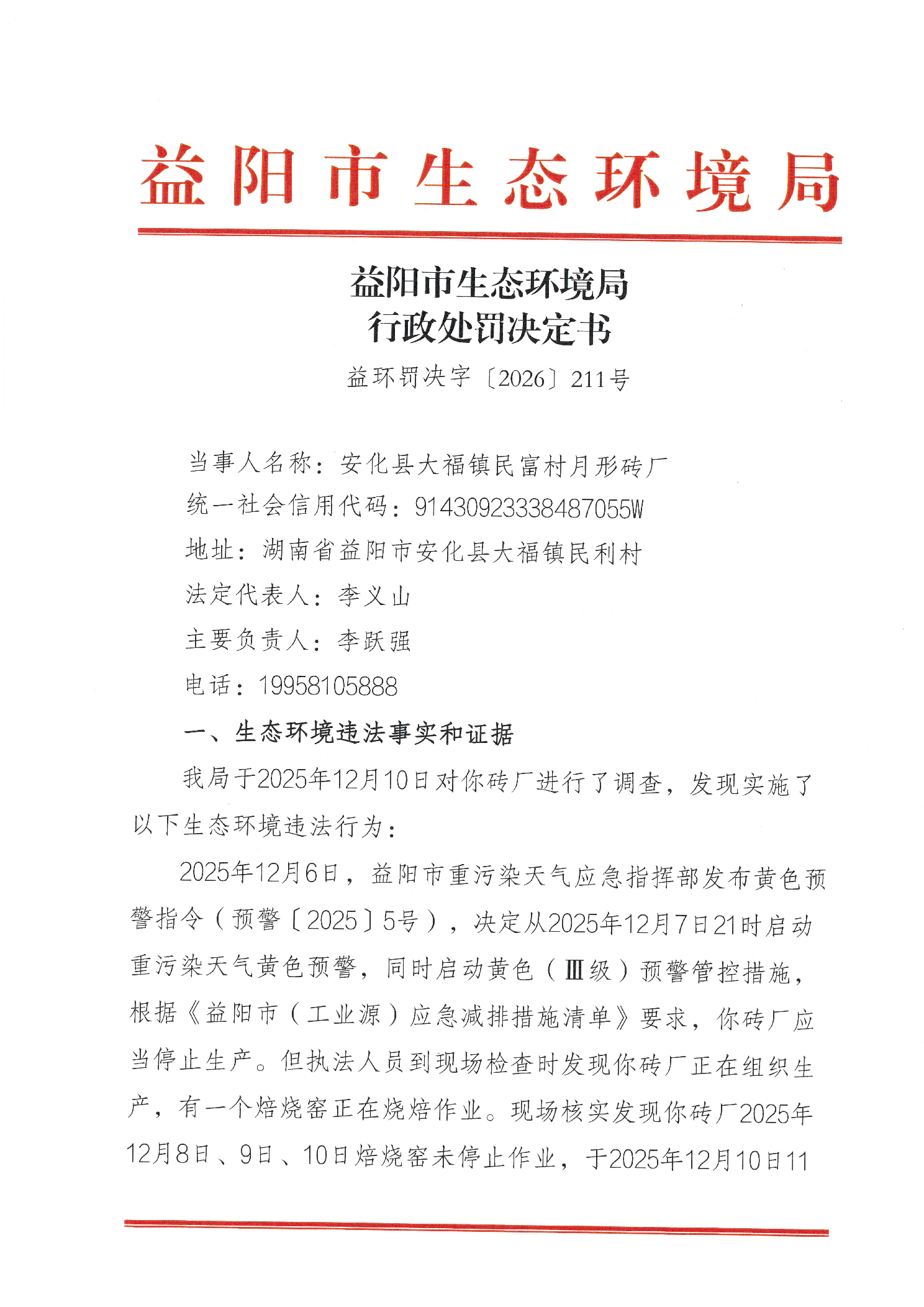 行政处罚决定书 益环罚决字〔2026〕211号 民富村月形砖厂