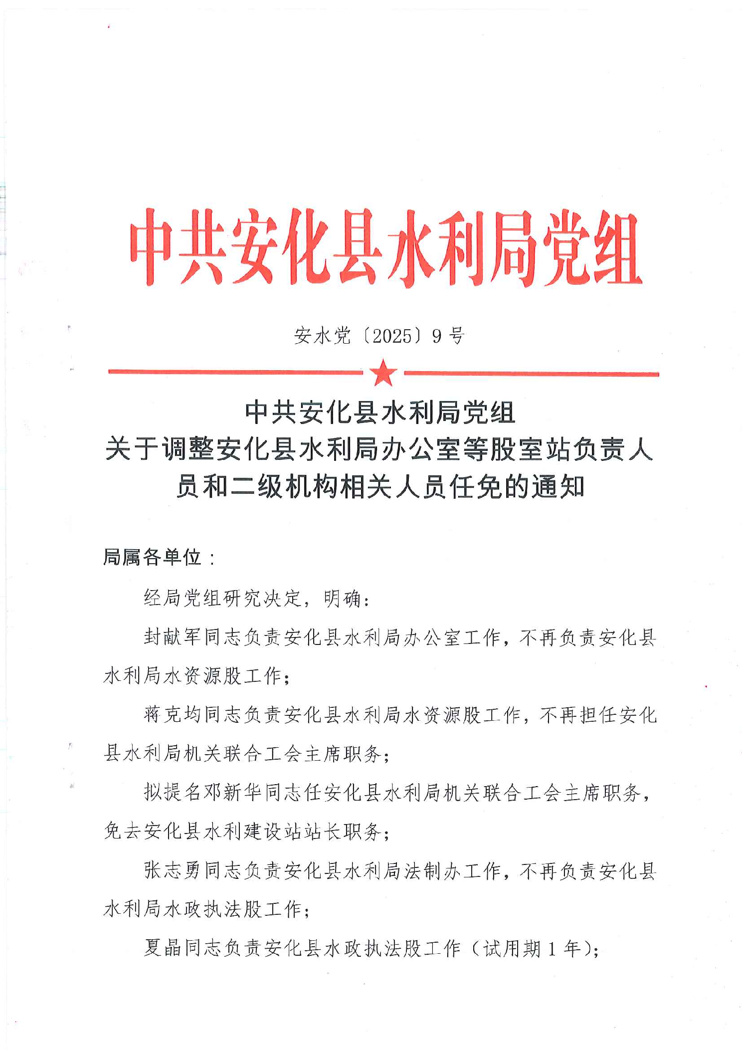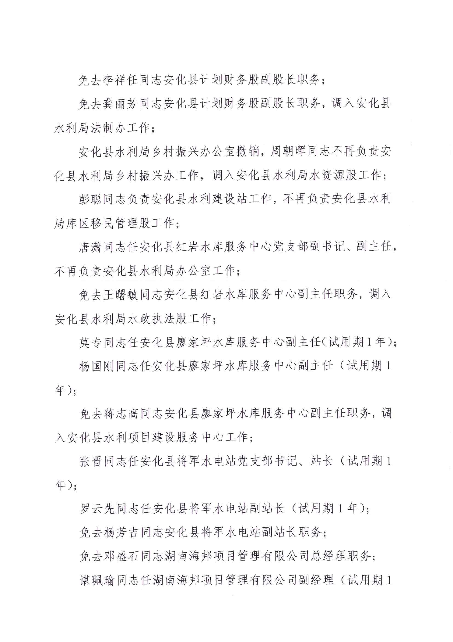 关于调整安化县水利局办公室等股室站负责人员和二级机构相关人员任免的通知