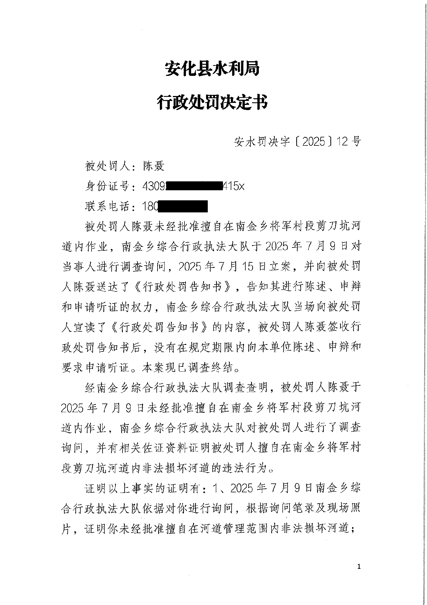 安化县水利局行政处罚决定书 安水罚决字(2025)12号