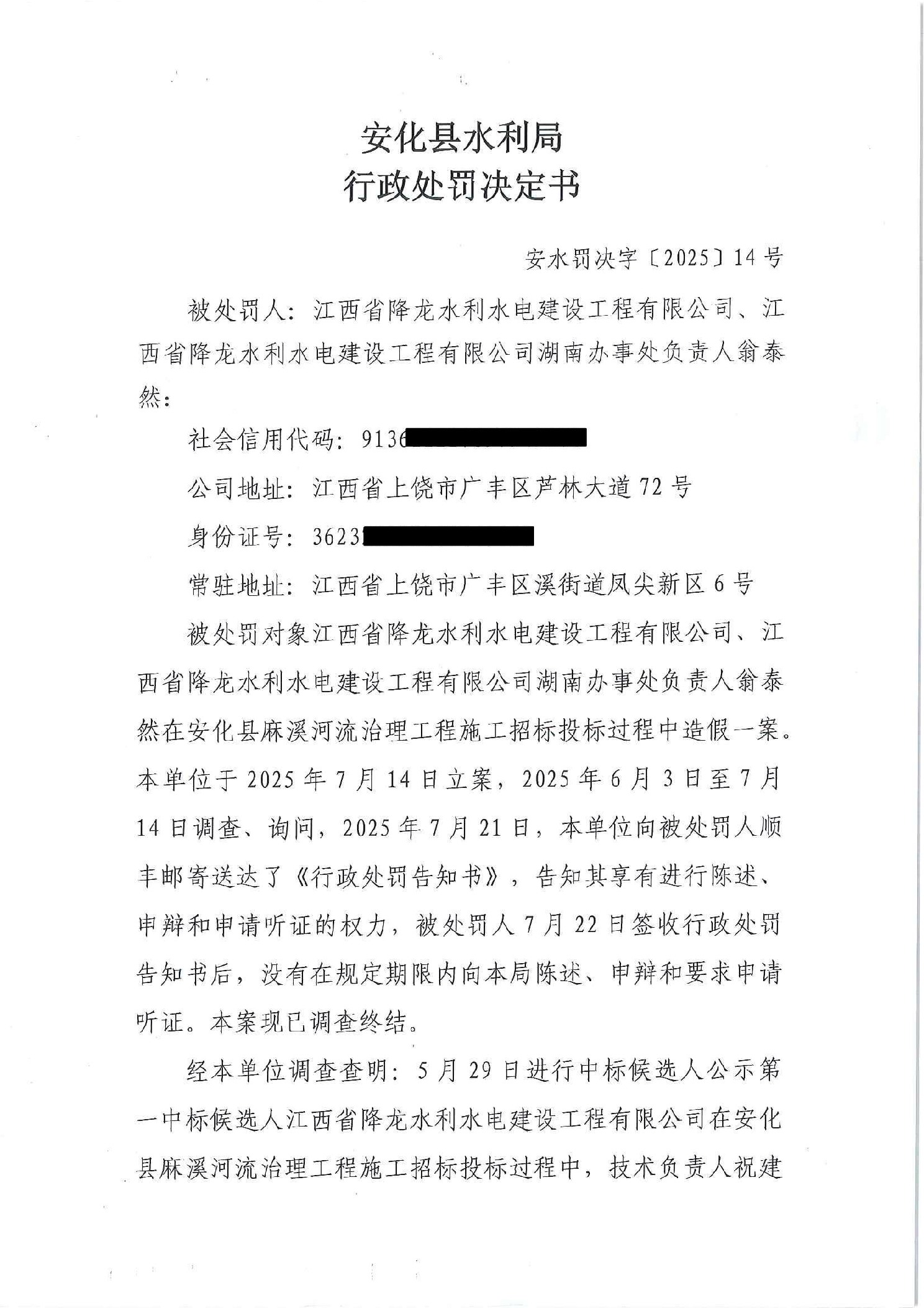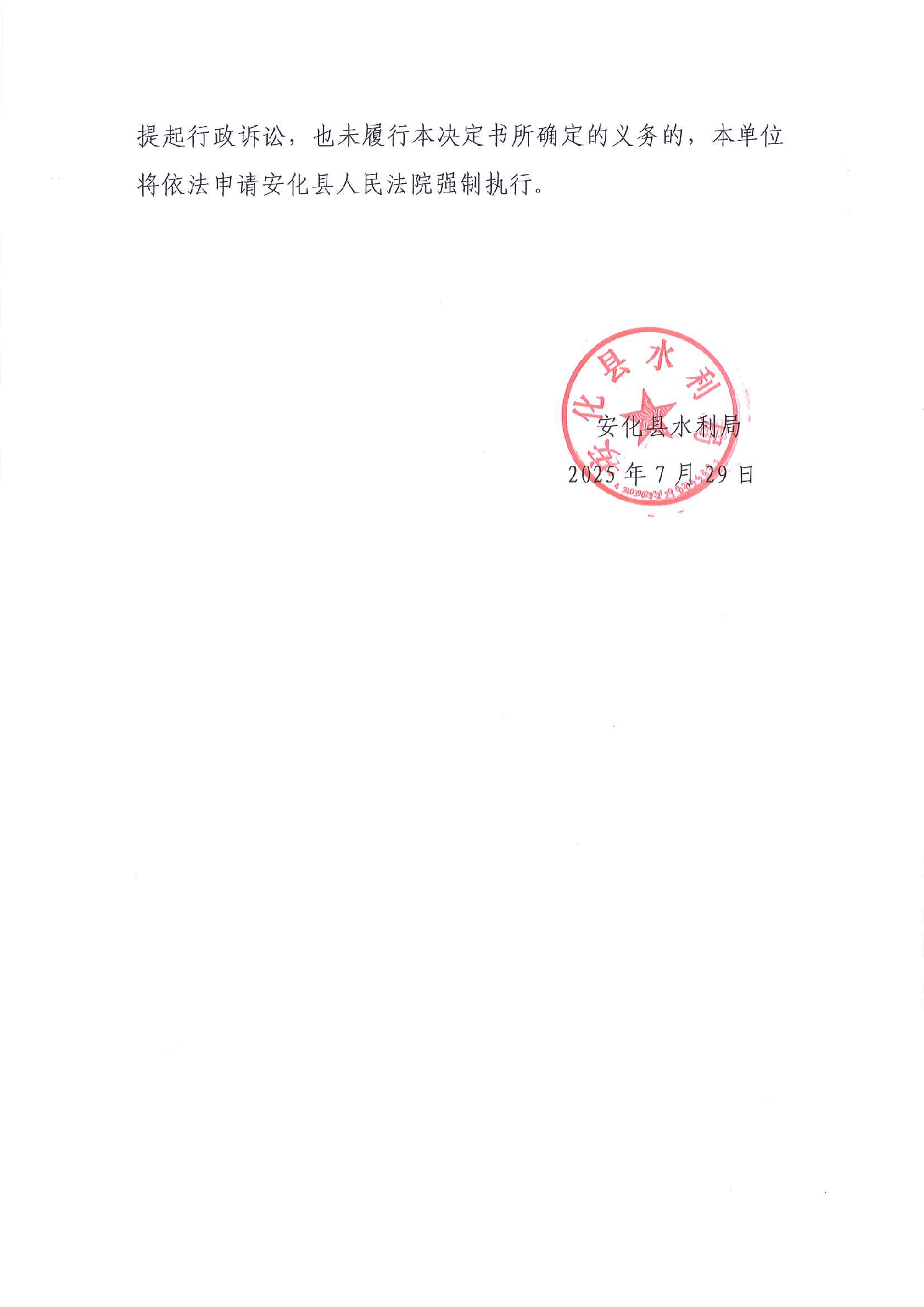 安化县水利局行政处罚决定书 安水罚决字(2025)14号