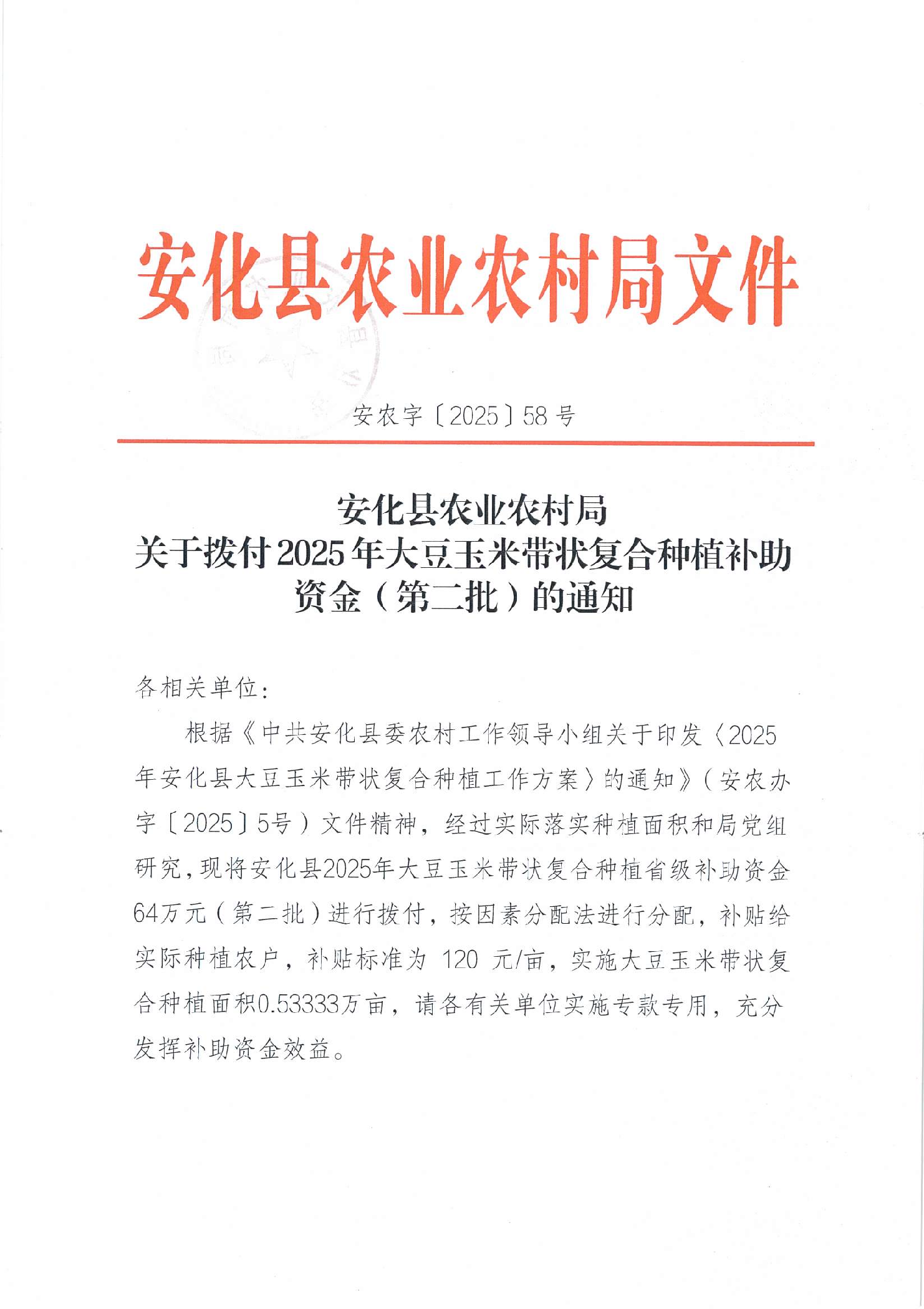 安化县农业农村局 关于拨付2025年大豆玉米带状复合种植补助 资金(第二批)的通知