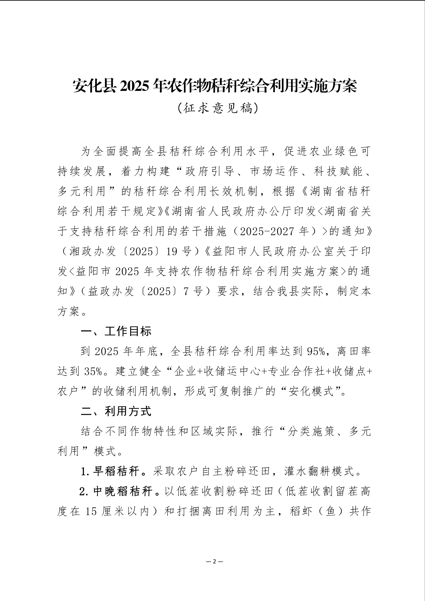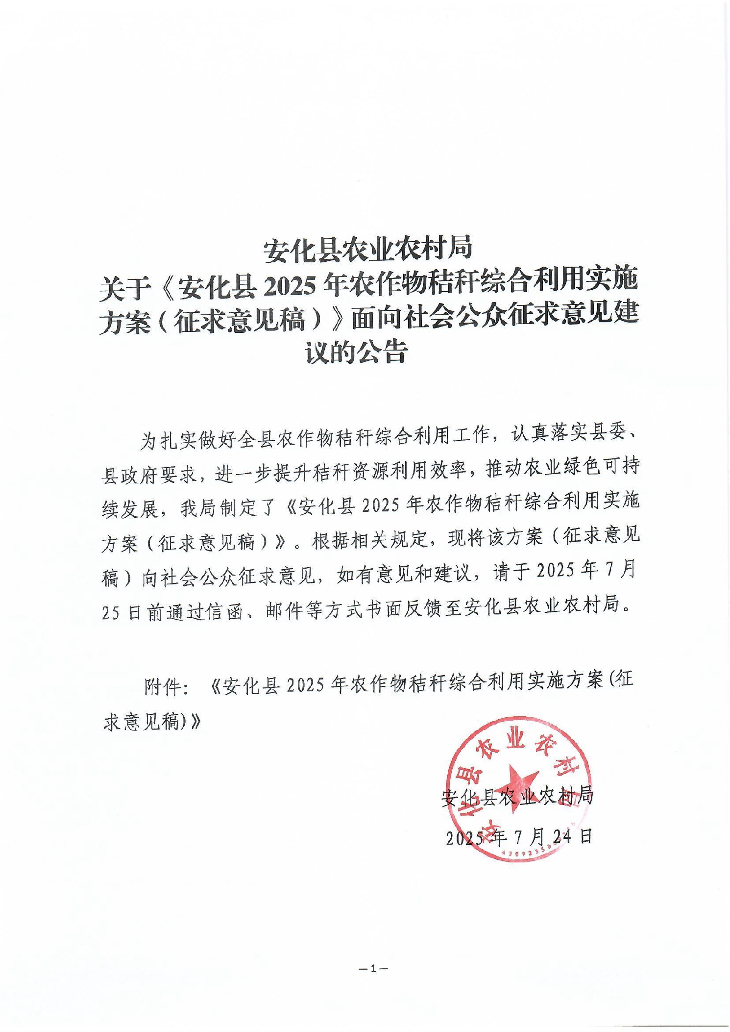 安化县农业农村局关于《安化县2025年农作物秸秆综合利用实施方案(征求意见稿)》面向社会公众征求意见建议的公告