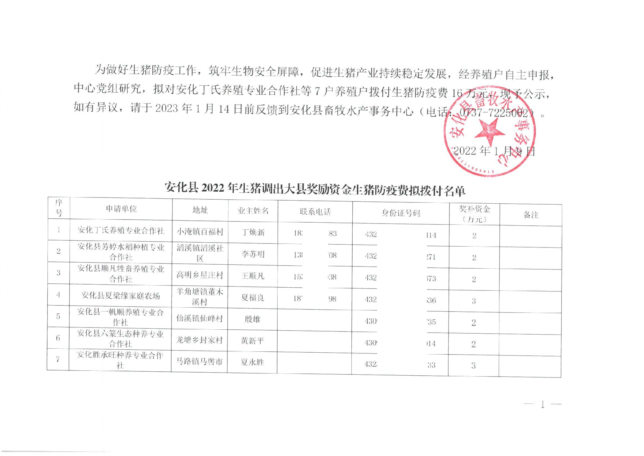 安化县2022年生猪调出大县奖励资金生猪防疫费拟拨付名单