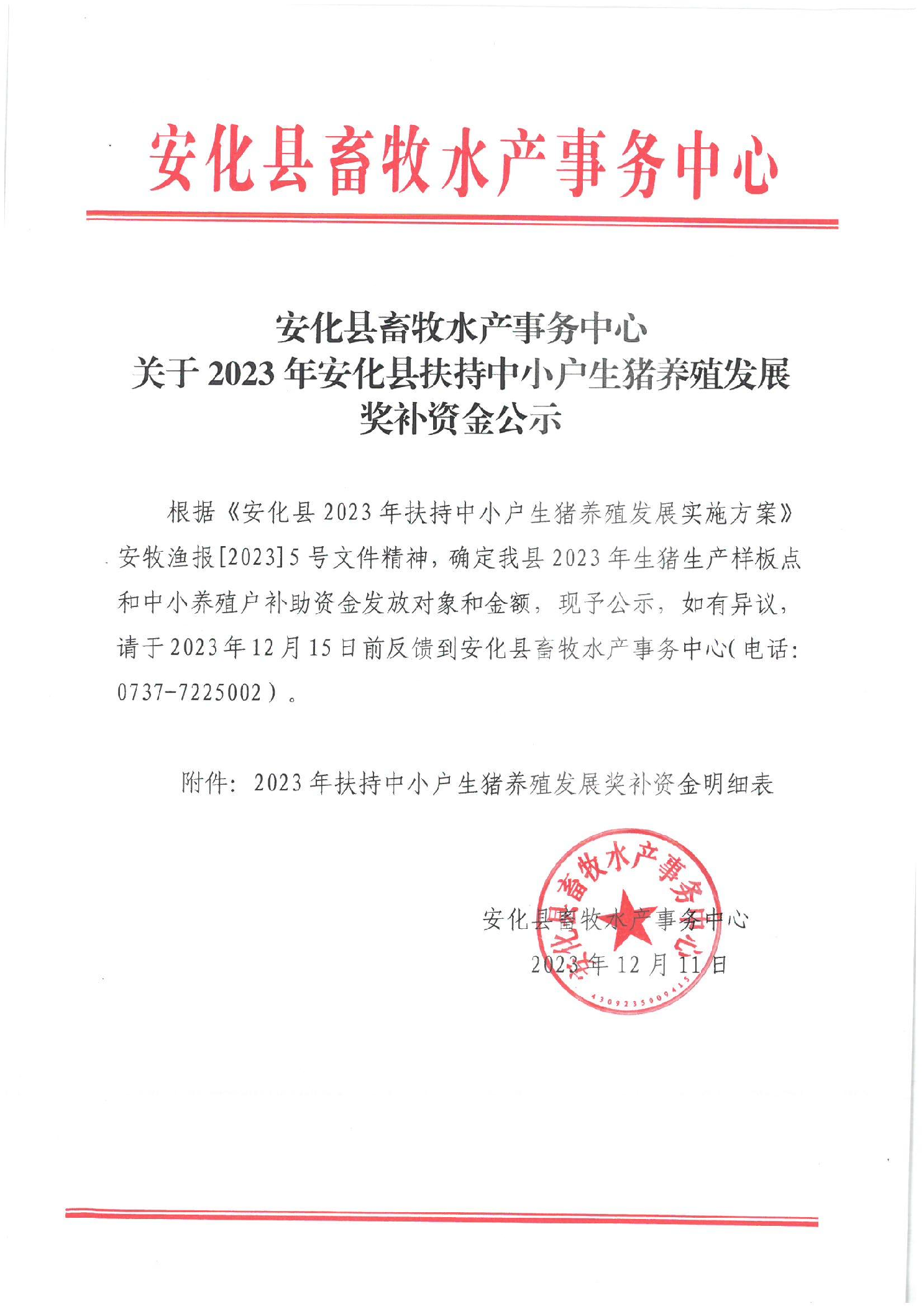 2023年安化县扶持中小户生猪养殖发展奖补资金公示