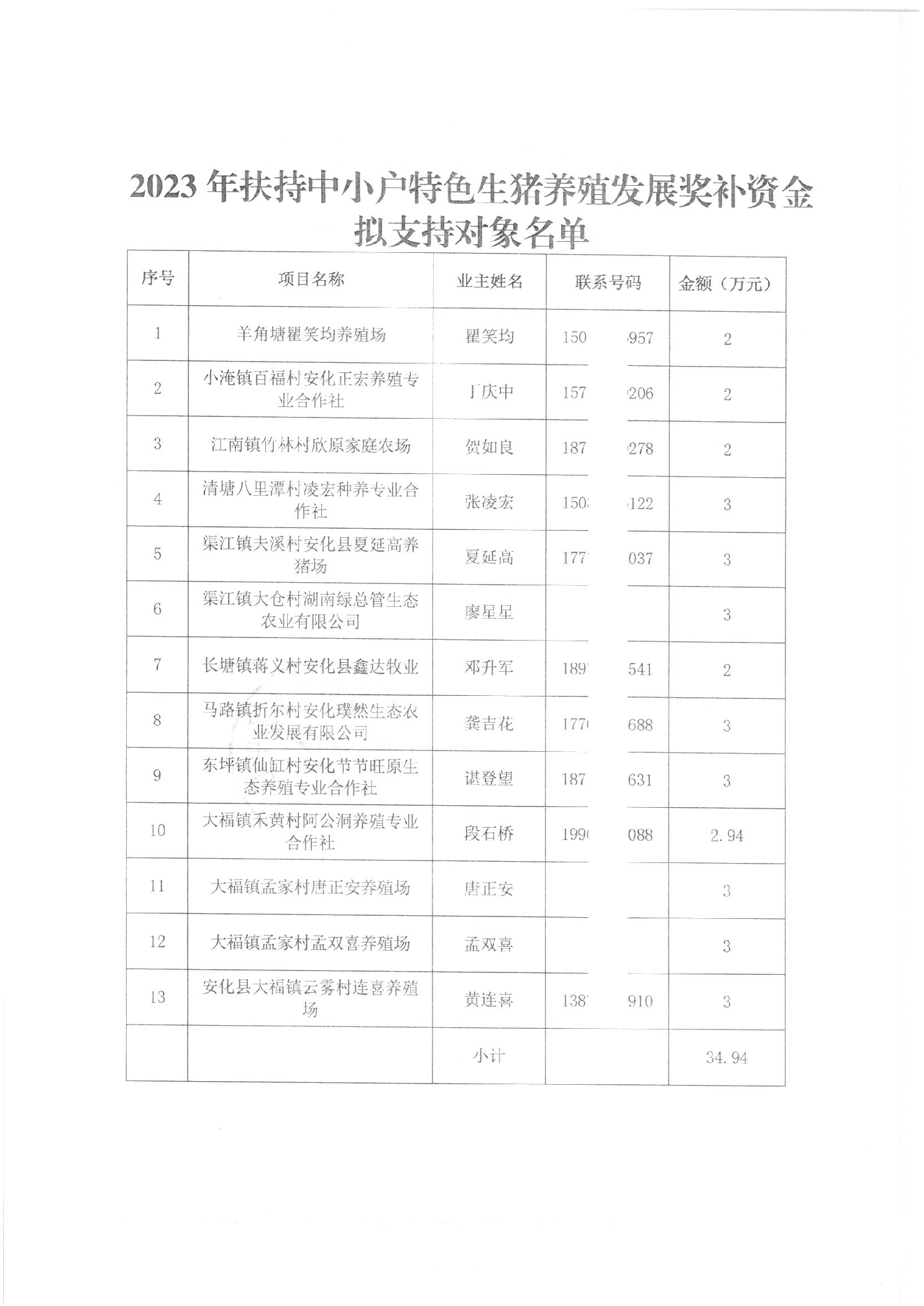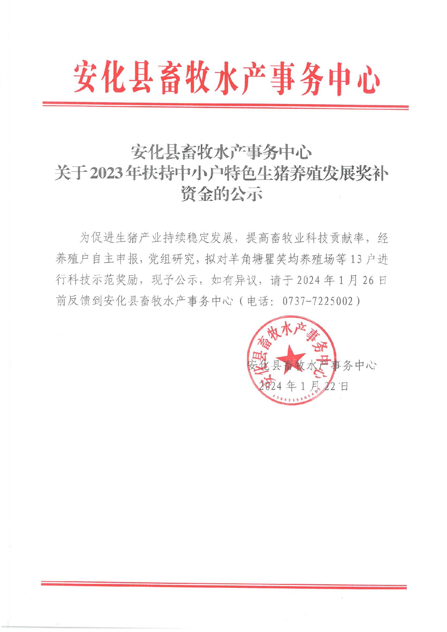 关于2023年扶持中小户特色生猪养殖发展奖补资金的公示