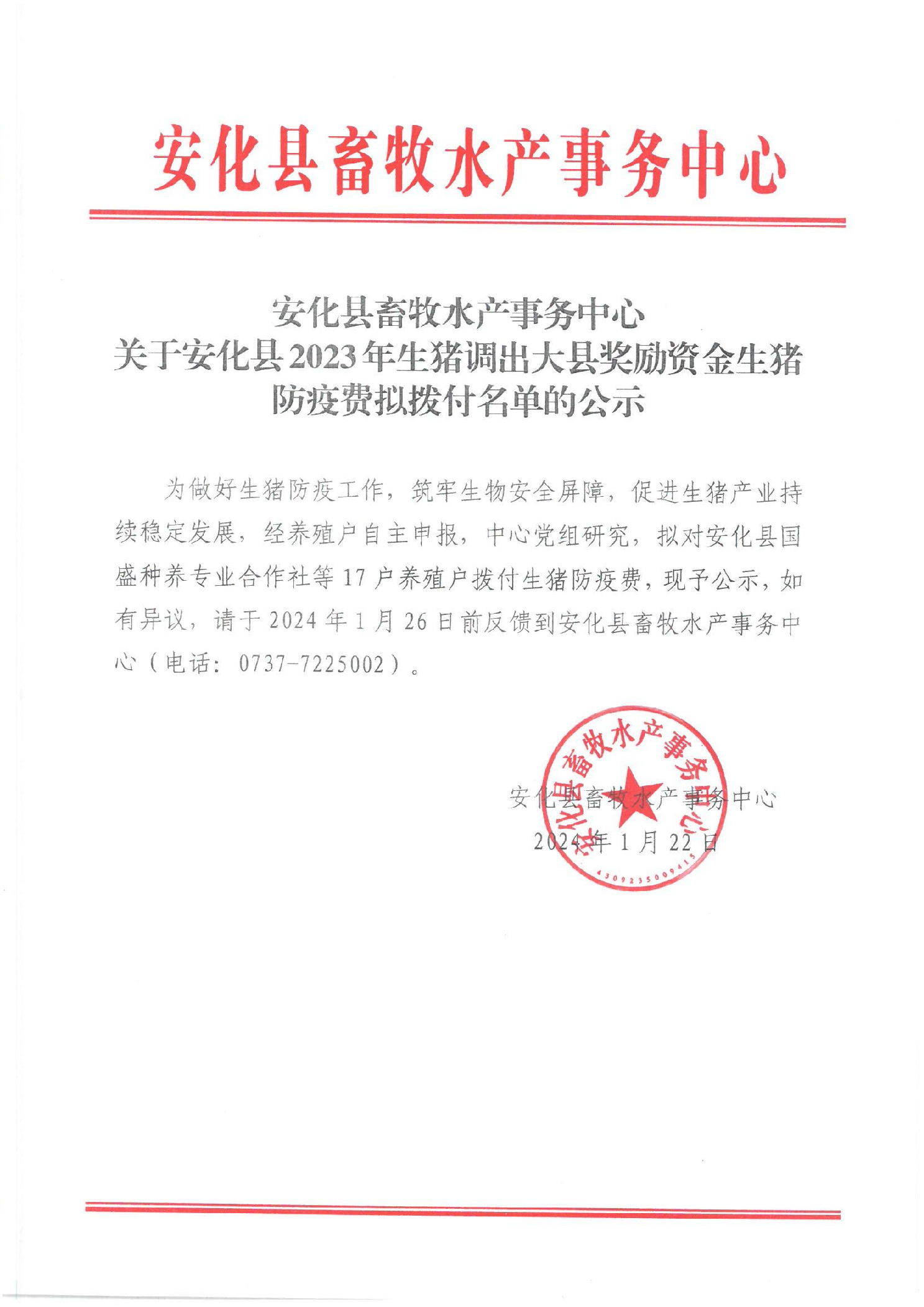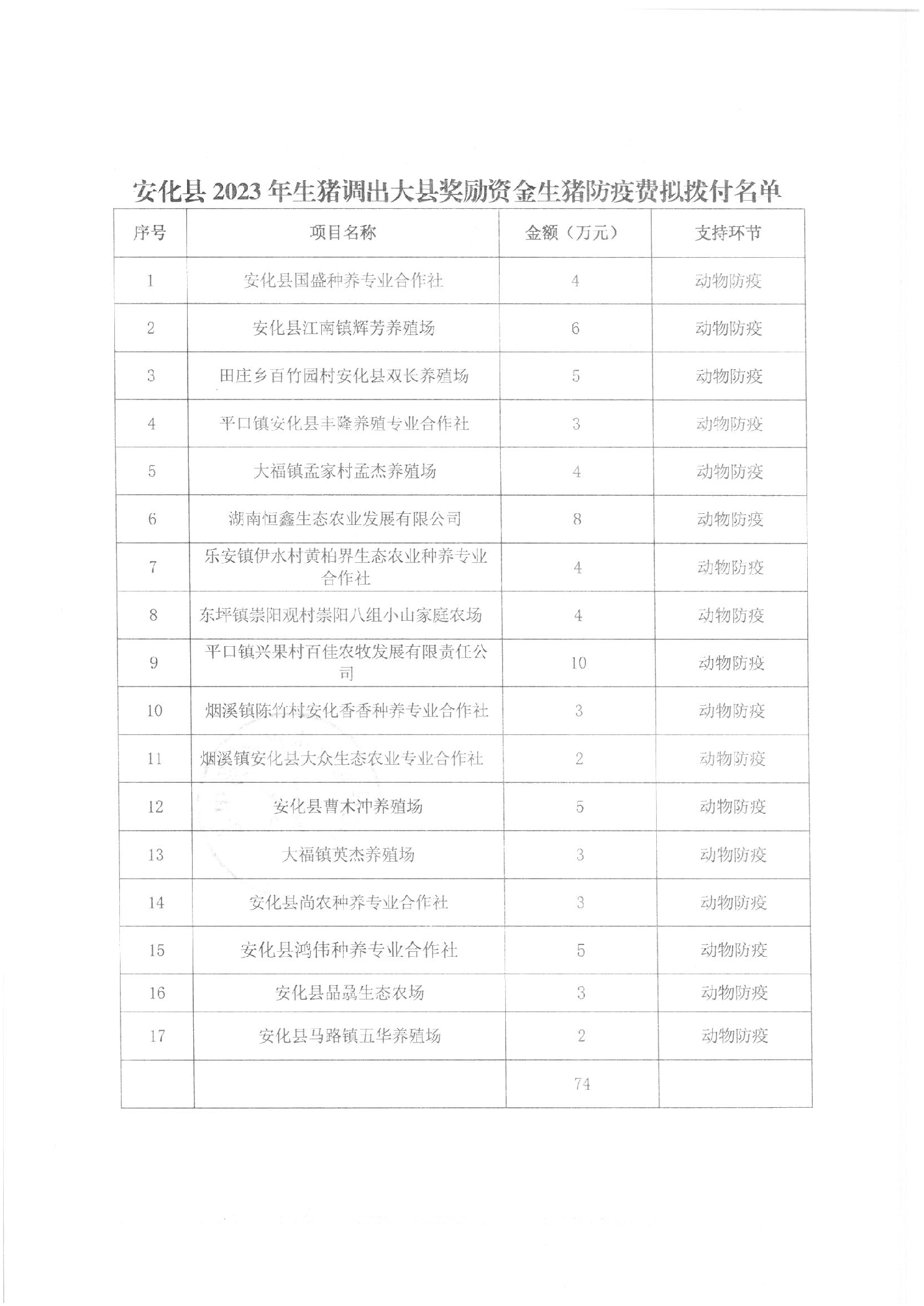 关于安化县2023年生猪调出大县奖励资金生猪防疫费拟拨付名单的公示