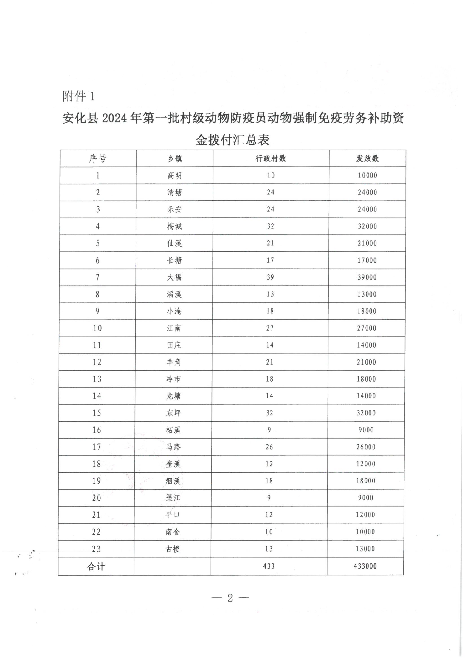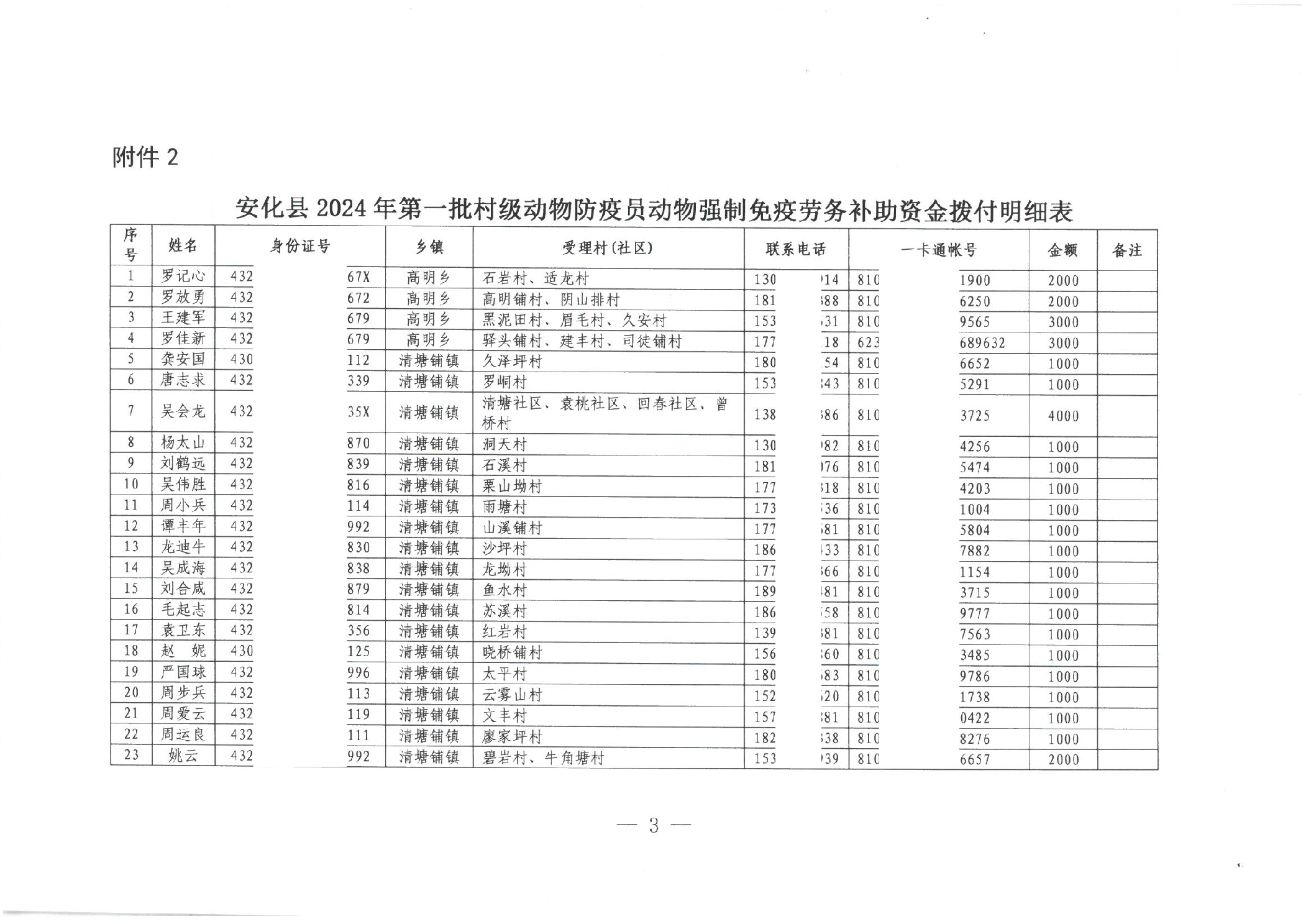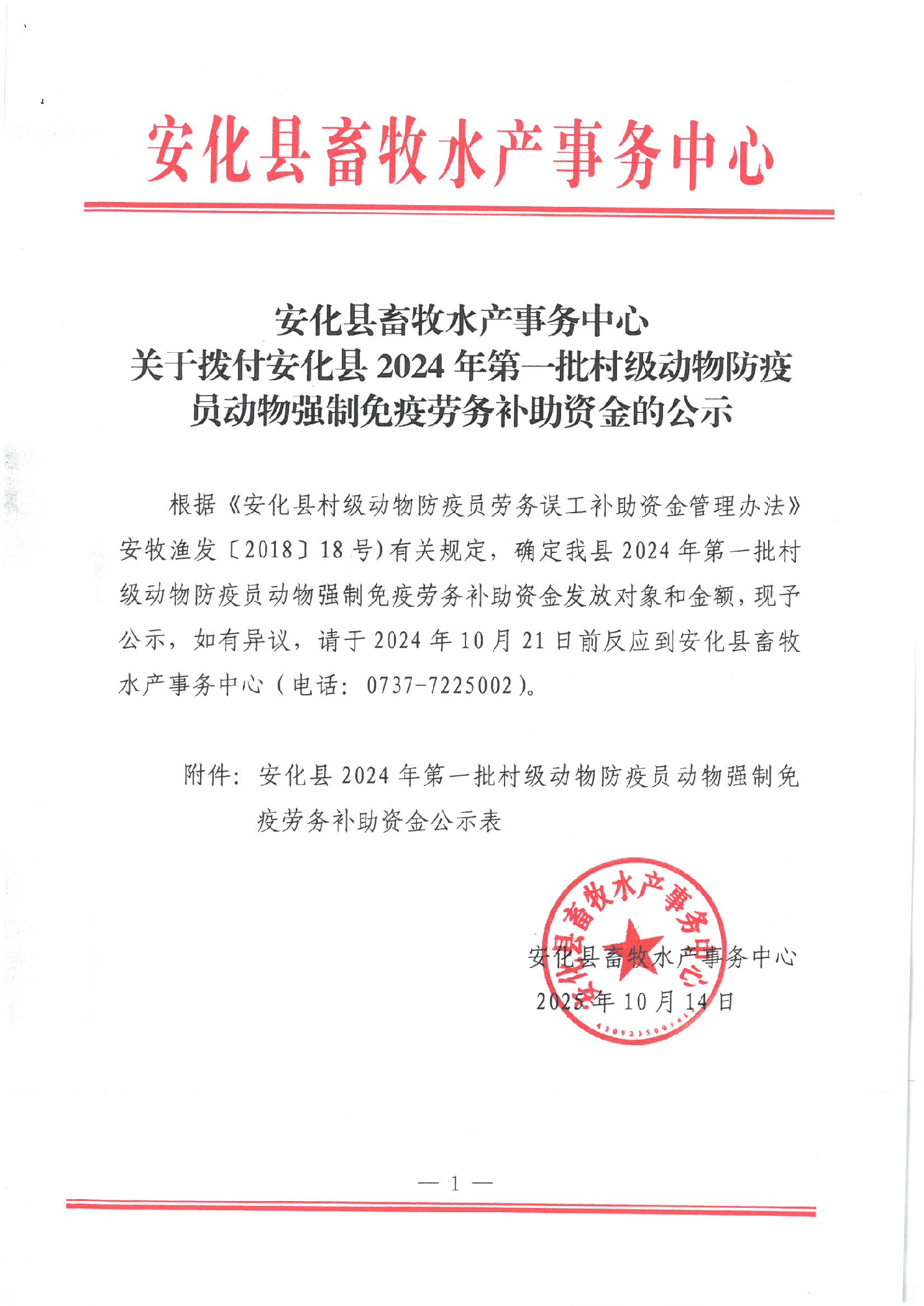 关于拨付安化县2024年第一批村级动物防疫员动物强制免疫劳务补助资金的公示
