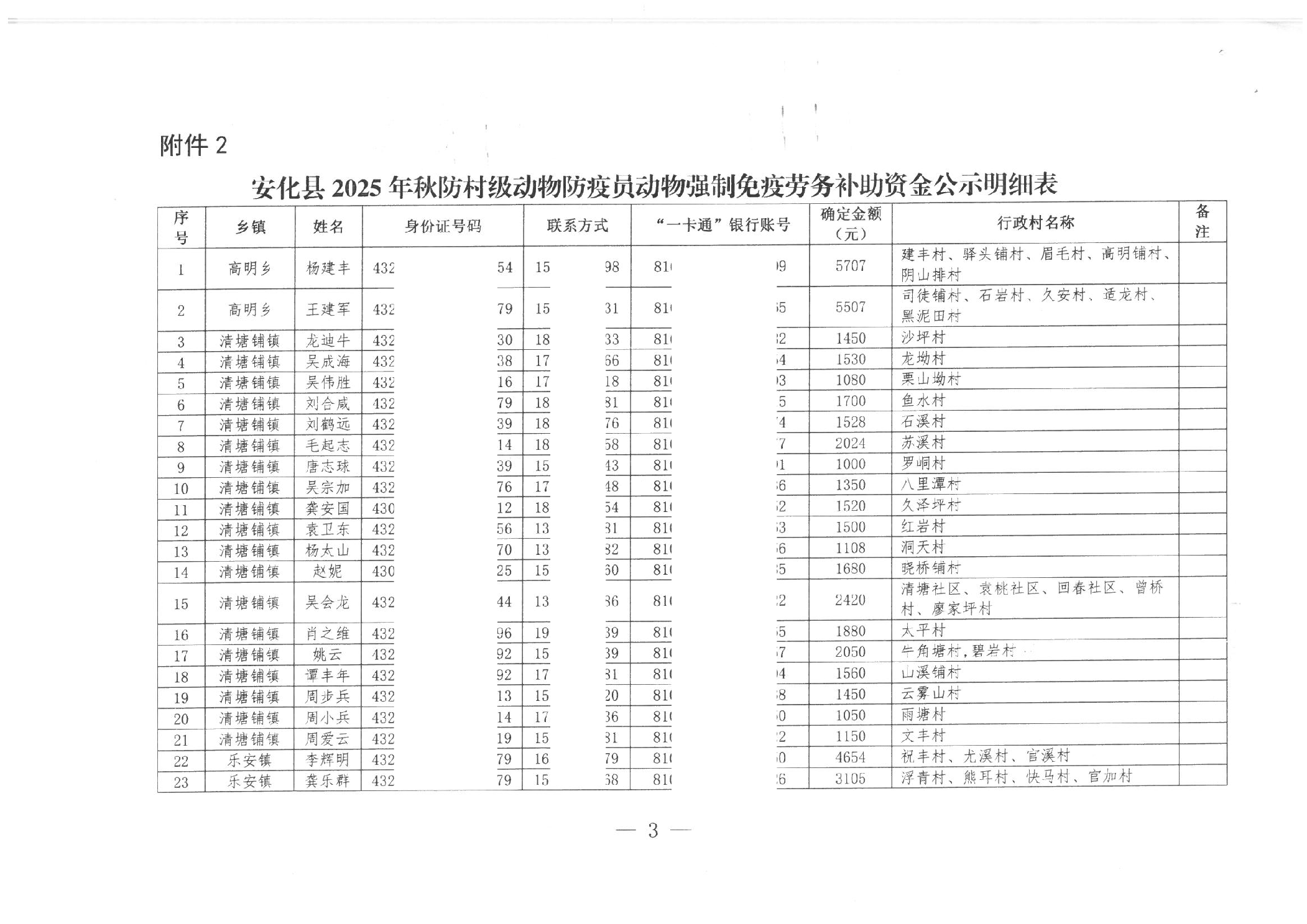 关于发放安化县2025年秋防村级动物防疫员动物强制免疫劳务补助资金的公示