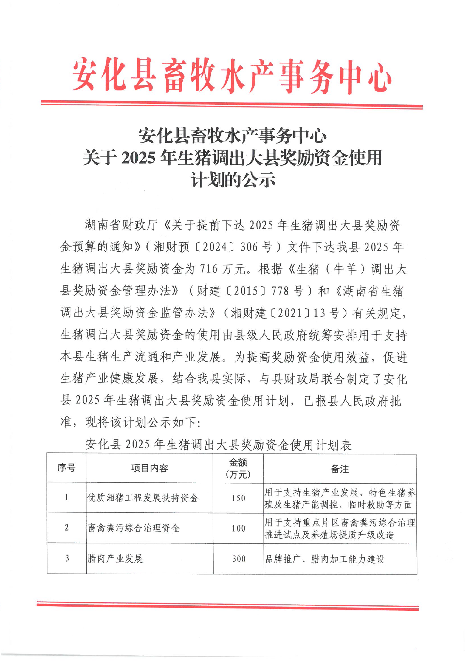 关于2025年生猪调出大县奖励资金使用计划的公示