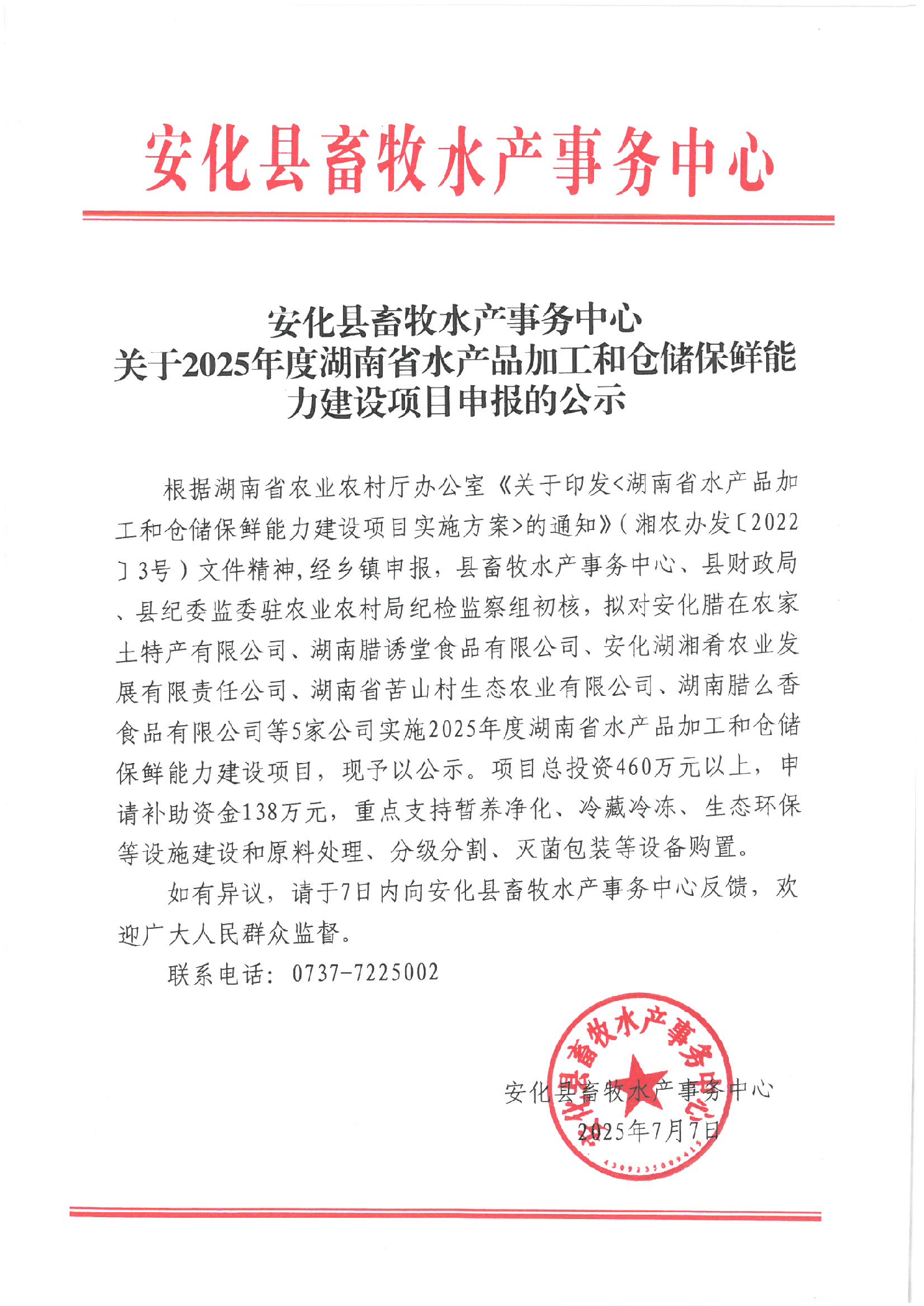 关于2025年度湖南省水产品加工和仓储保鲜能力建设项目申报的公示